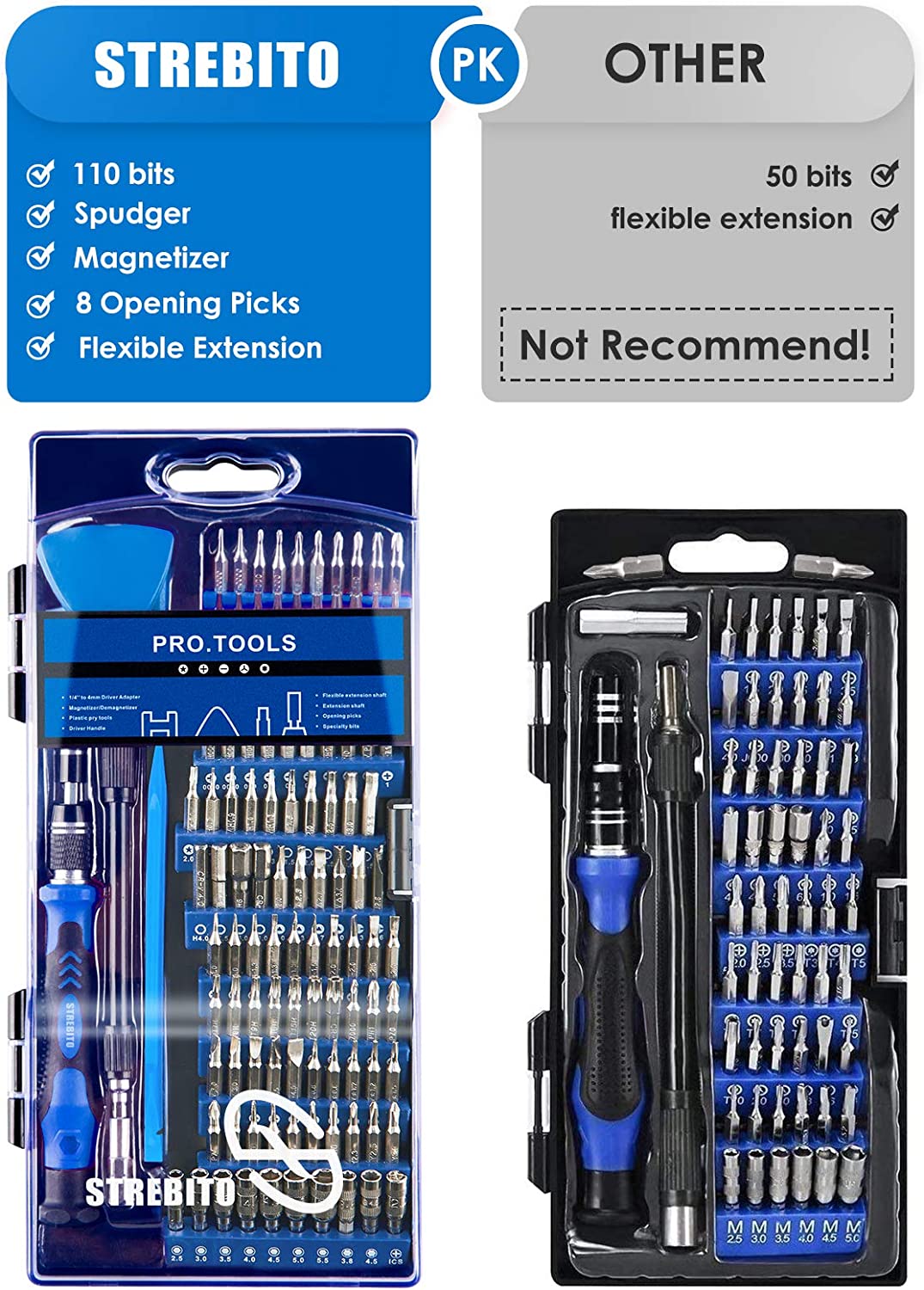 - 【Practical Accessories】The magnetizer demagnetizer tool can adjust the magnetism of the bits, strong magnetism for grabbing screws, and weak for protecting sensitive electronics. One flexible extension shaft helps to reach tight spot. The 1/4" to 4mm driver adapter allows the bits to be used by electric screwdriver. The opening picks and spudger help you open tech devices and safely remove components with ease