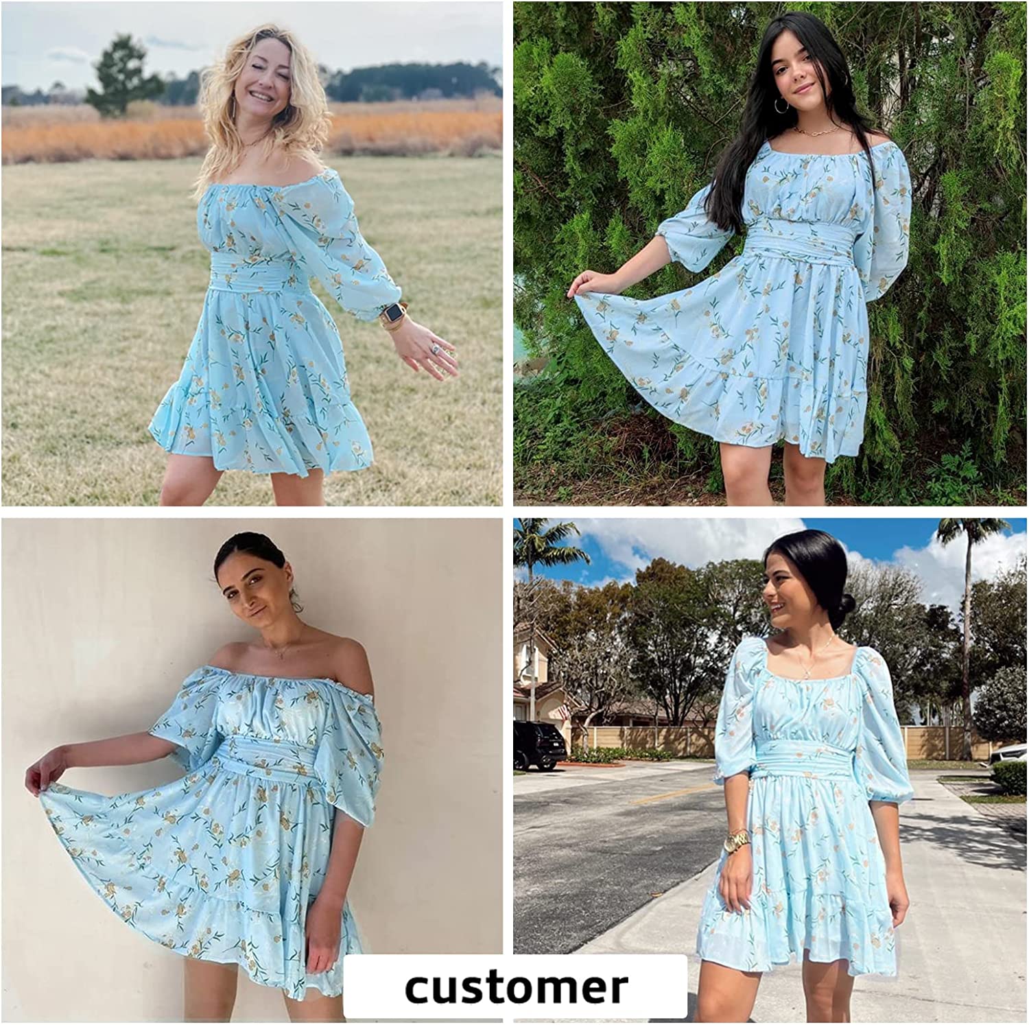 Design: square collar and lantern sleeves bring a retro style. The sleeves can be pulled down for a cute off-shoulder look. The elastic smocked waist dress shows the body curves. Sexy open back with adjustable self-tie bowknot. Pretty ruffle hemline finish.