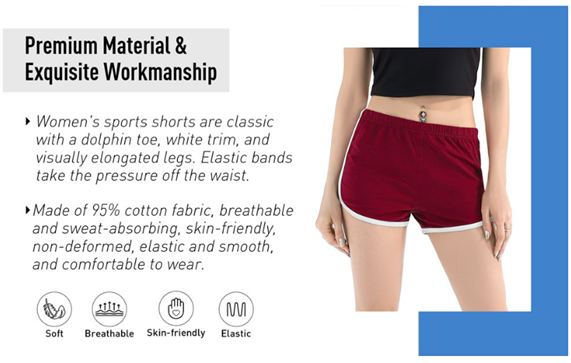 • CLASSIC DESIGN: Women's sports shorts are classic with a dolphin toe, white trim, and visually elongated legs. Elastic bands take the pressure off the waist. Be extra fashionable while doing your daily routine exercise with these high-quality shorts.