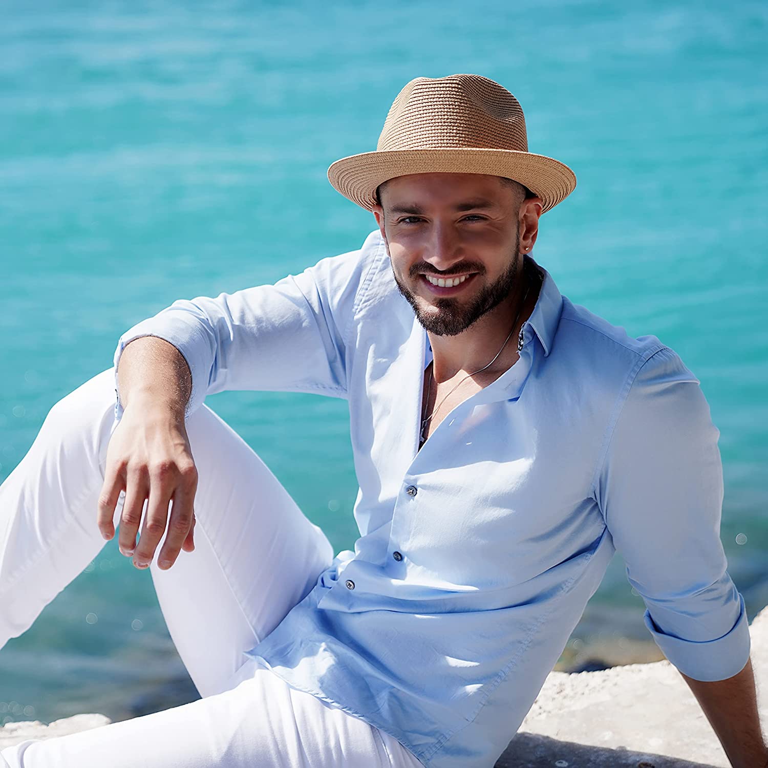 Upgrade your summer style with Lanzom's Straw Fedora Hat - the perfect Summer Beach Sun Hat for Men and Women who love outdoor travel, holiday, or beach playing.