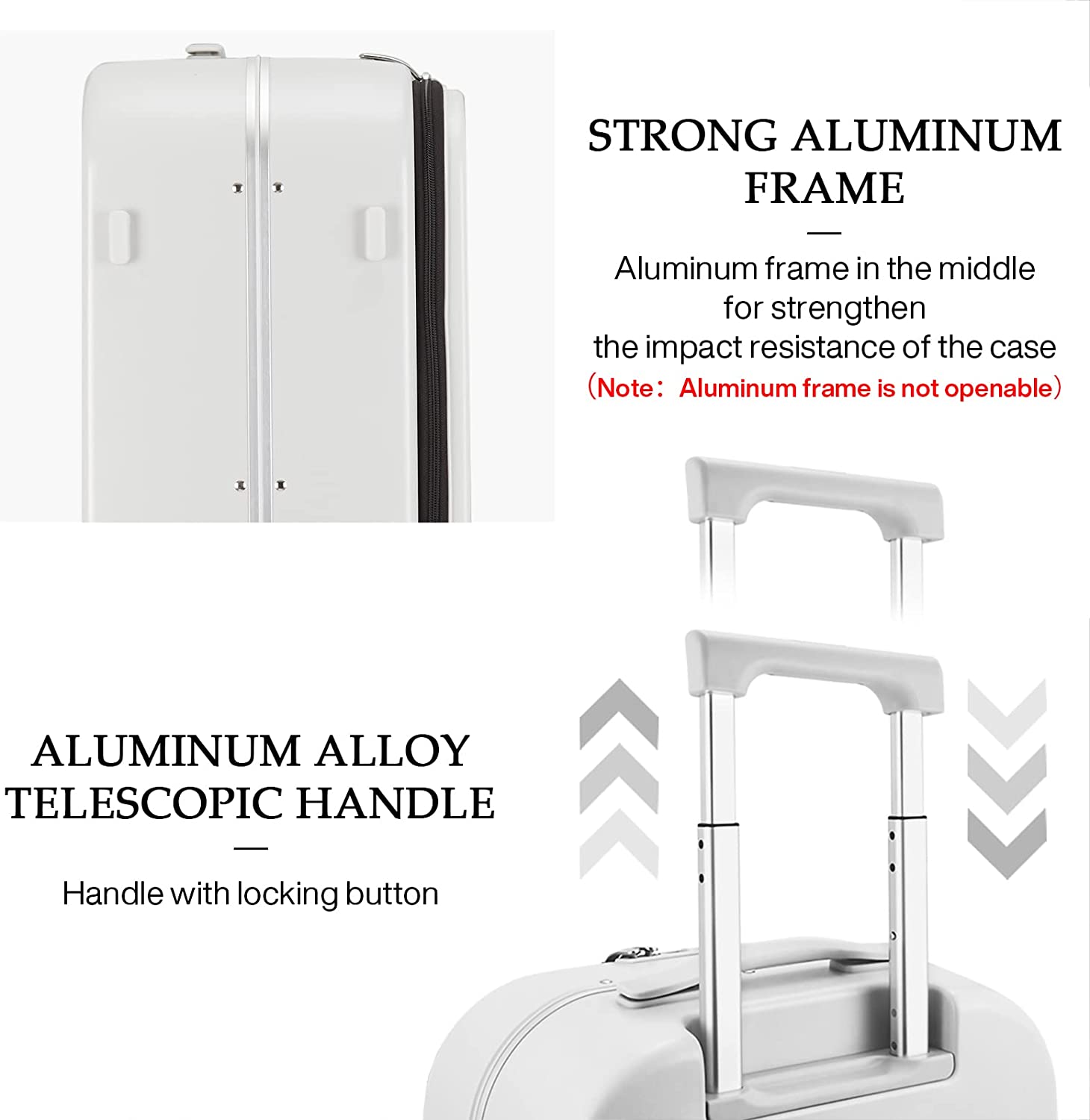 • 【DURABLE TRAVEL SUITCASE】Benefits from German Bayer PC material to prevent easily cracking or breaking, and Aluminum frame in the middle strengthen the impact resistance of the case, makes it more solid. (Aluminum frame is not openable)