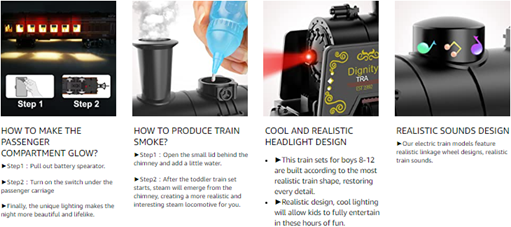 ►There are 4 carriages in total, and the steam train and train wheels are made of metal. The passenger carriages has warm lights, which makes this train toys for boys 4-7 more realistic.