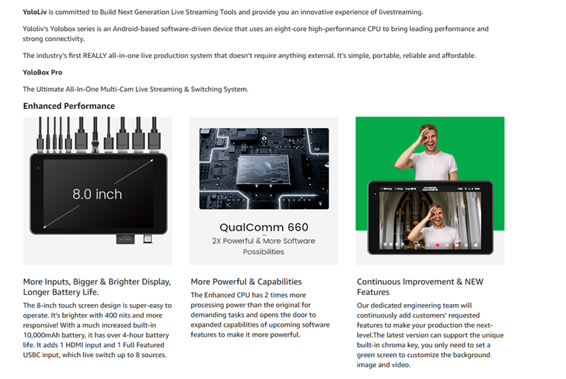 - 【Stronger and More Powerful】 YoloBox Pro has more HDMI Inputs, Bigger & Brighter Display, Longer Battery Life, Enhanced CPU. The 8-inch touch screen design is still super-easy to operate, control at your fingertip, just as your smartphone. It’s brighter with 400 nits and more responsive! With a much increased built-in 10,000mAh battery, it has over 4-hour battery life. The NEW CPU from QualComm SnapDragon has 2 times more processing power than the original for demanding tasks.