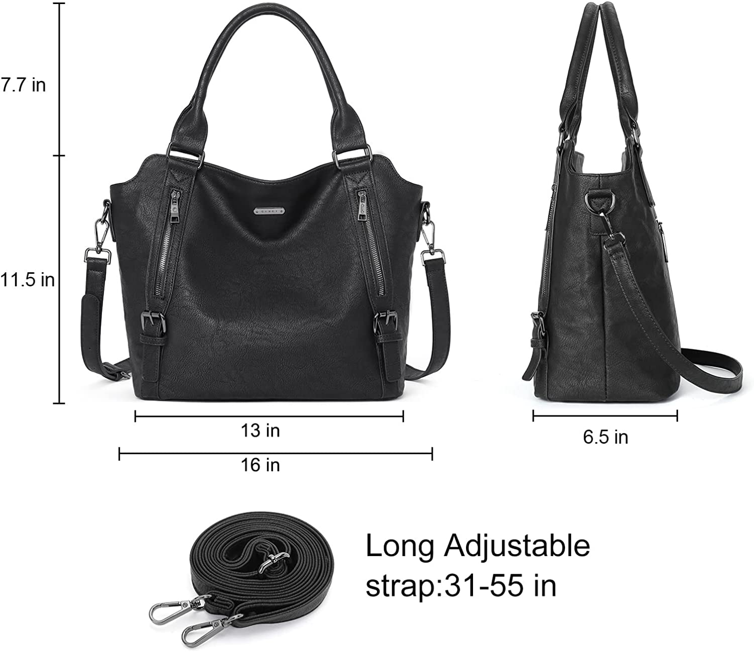 • 【Practical Size】: (L)16" x (W)6.5" x (H)11.5"; 1.98 lb/0.9kg. Long adjustable strap length: 31-55 inches (adjustable), height: 13.5-25.5 inches. The top handle drop is 7.7 inches. The large hobo bag can hold your iPad, iPhone, water bottle, wallet, cosmetics, umbrella, keys and other things.