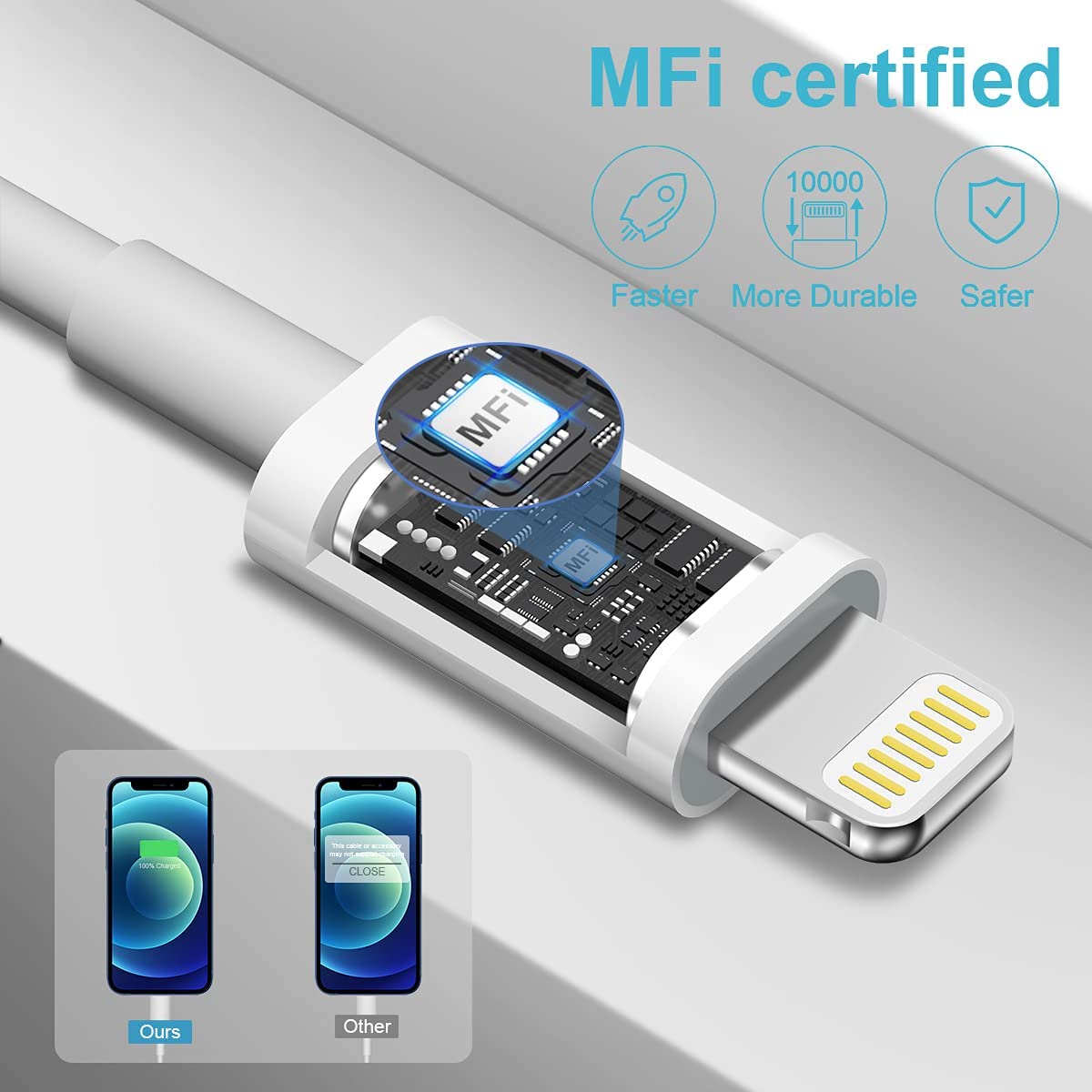 - [Apple MFi Certified Charging Cable] With the Apple MFi Chip, the Charging cord equips automatic chip recognition function. The Apple MFi Certification ensures 100% flawless compatibility with Apple devices. No more trigger warning messages. And synchronize Photos, Music, Videos and Files at a data transfer speed of up to 480Mbps(30MB/S). The transfer of 1G large files finished in 25s.