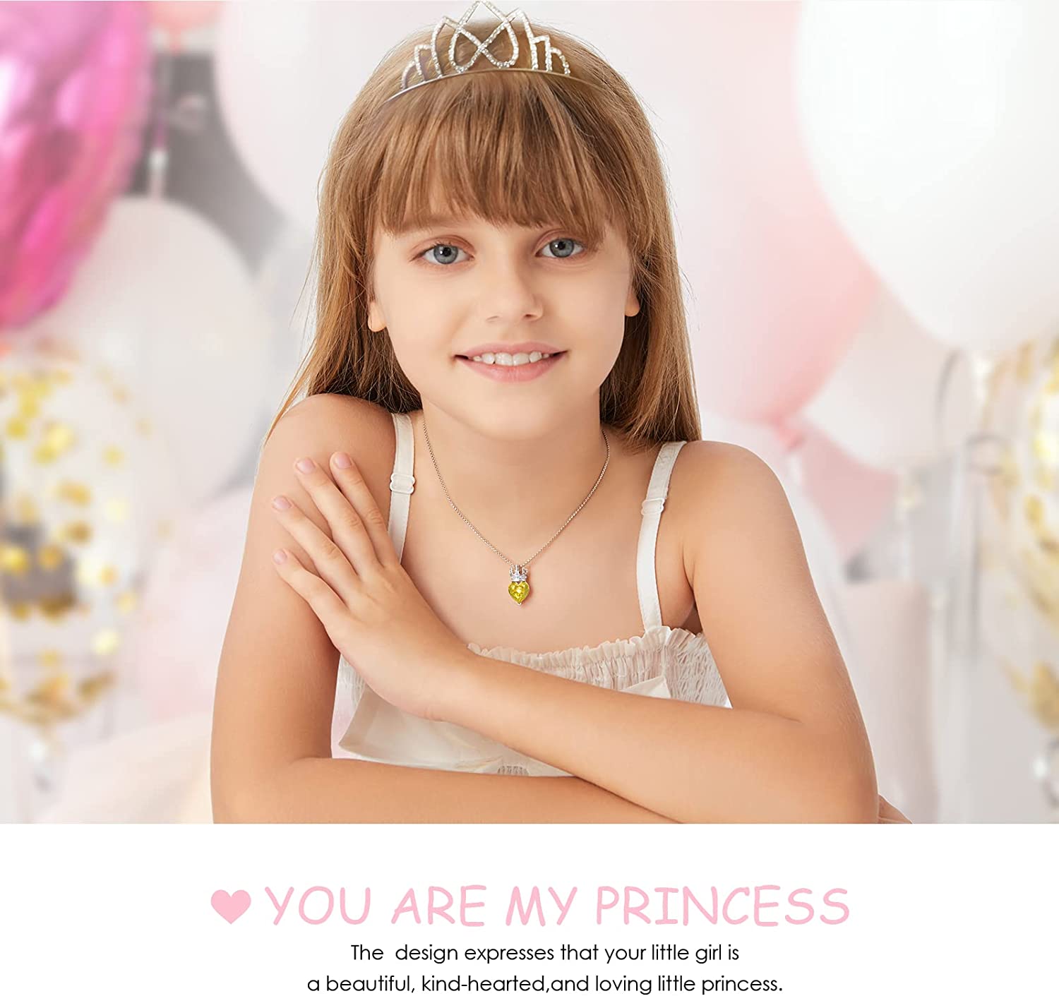 CROWN HEART NECKLACE: The heart pendant necklace features a dreamy crystal adorned with a small sparkling crown. The graceful crowned heart design expresses that your little girl is a beautiful, kind-hearted, independent and loving little princess.
