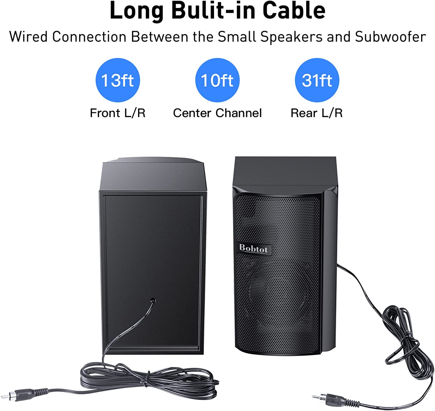 - 5.0 Bluetooth Connection & Wired Connection: The 5 speakers with built-in cable to connect with the subwoofer, long enough can be placed anywhere. Cable Length: Front Speakers L/R: 13Ft, Rear Speakers L/R: 31Ft, Center Speaker: 10Ft. Bluetooth 5.0 technology supports you to directly connect with Bluetooth devices