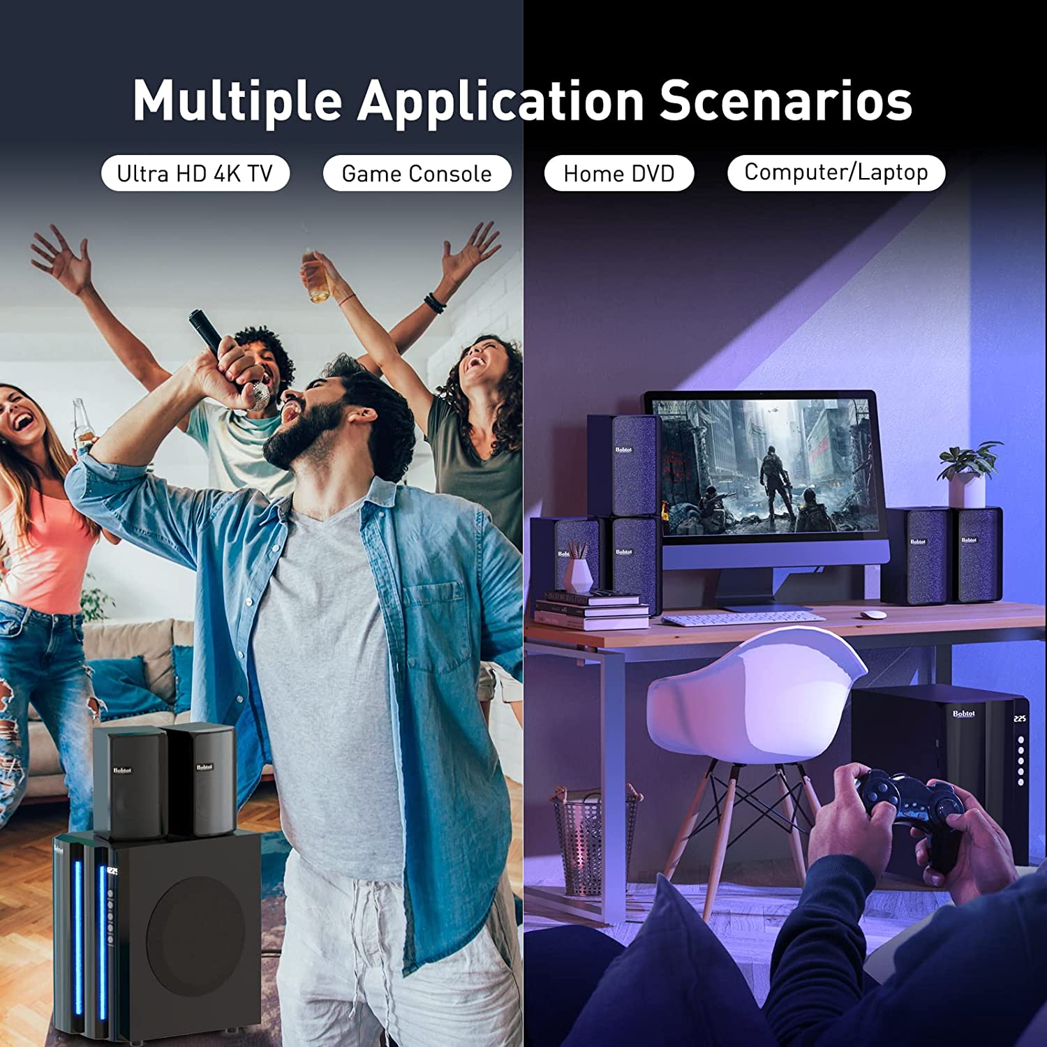 - Multiple Application: Easily plug and play, speakers are widely used for numerous scenarios such as Ultra HD 4K TV, game console, home DVD, computer, laptops, Projector. It's very suitable for watching movies, watching football games, partying, and e-sports games with friends at home