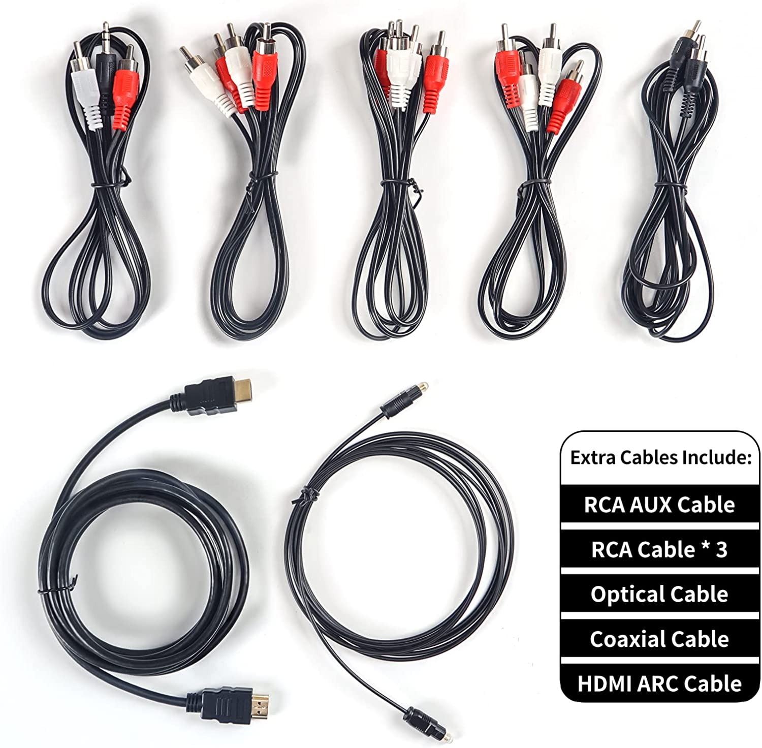 - Multimedia Support: 5.0 Bluetooth speakers can connect to various smart devices, and support multiple input modes like TV ARC/OPT/COA/AUX/USB/DVD, Additional cables include HDMI ARC cable/Optical cable/Coaxial cable/RCA cable/Antenna cable/Aux cable that can support any application in need