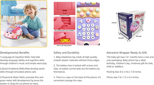 ☎【Safe material and durable】: baby phone toys meet the U.S. toy standards, made of smooth plastic material, no sharp edges, polished smooth, and burr-free. Keep your child away from harm while playing happily. It is very durable and can promote the healthy growth of children. boys baby telephone safety tested and 3C certified.Cell phone toys require 3 AA batteries (not included).The battery is fixed with screws, the baby cannot remove the battery by itself.