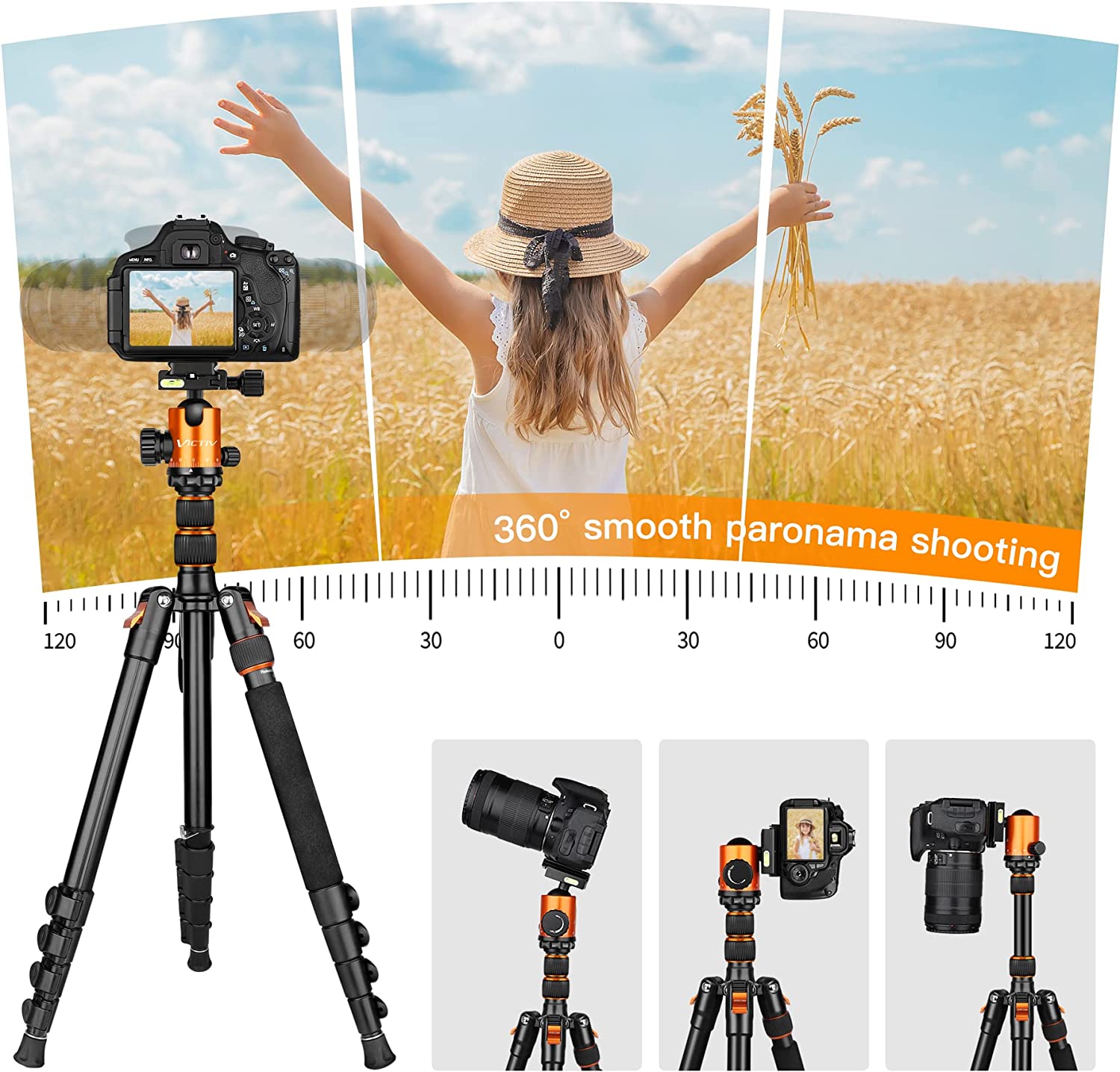 【High Quality & Flexible Design】 Made of aluminum alloy, light but strong tripod is with 3 built-in bubble levels and 2 quick release plats. 36mm ALUMINUM ball head that can rotate freely 360 degrees has strong wear and corrosion resistance. It provides a comfortable shooting experience and BETTER EQUIPMENT GUARANTEE each time