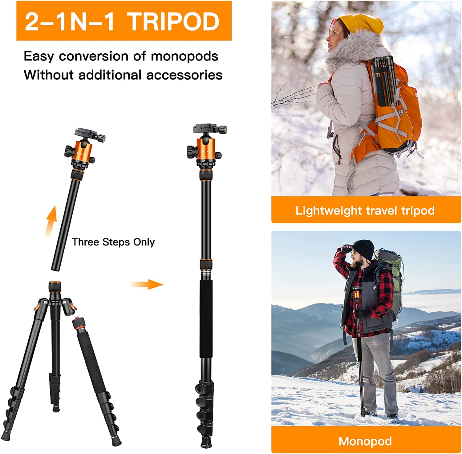 【Multi-functional Monopod】 A foam-cushioned, removable leg attaches to the center column to convert to full size 80 inches monopod with seconds. It can be used as a one-handed shooting artifact, or as a trekking pole when climbing or hiking