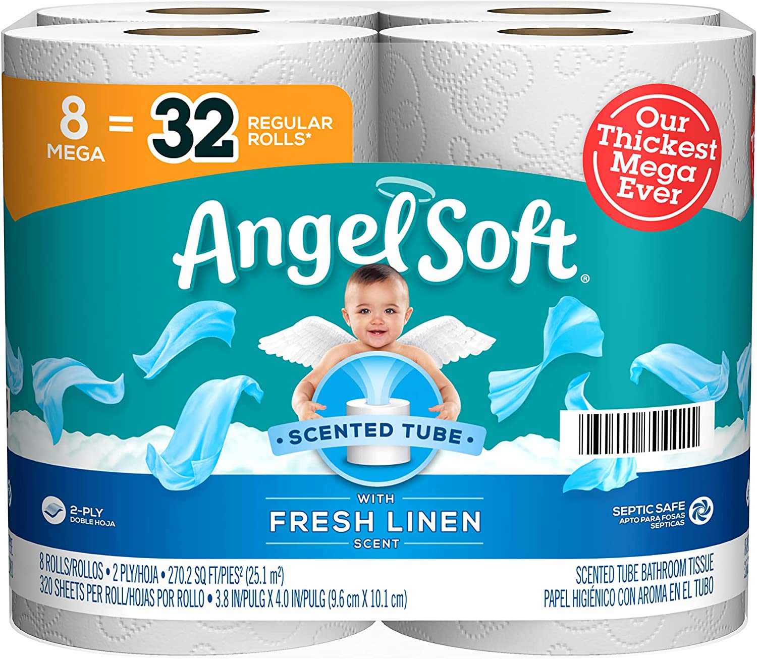 Angel Soft® Toilet Paper with Fresh Linen Scent, 8 Mega Rolls = 32 Regular Rolls, 320 Sheets each, 2-Ply Bath Tissue, 320 Count (Pack of 8)