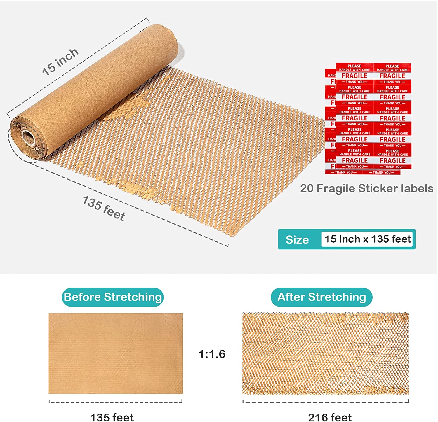 Honeycomb Packing Paper Size: 15 inch x 135 feet. Comes with 20 fragile sticker labels. Made of 54 lbs recyclable kraft paper. How it works: Strenthed honeycomb structure can get a protective padding, makes a better cushioning performance. Protect your items from breaking, such as dishes, glasses, crafts, frame, pictures, china, plates and cups, etc. Great for moving, shipping or wrapping breakables and delicate Items.