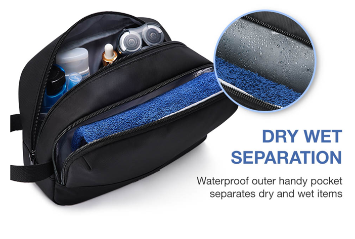 Roomy Capacity Toiletry Bag- Dimension: 10.2 x 3.5 x 6.3 inches. 1 capacious main compartment to hold all your toiletries and shaving supplies organized. There are 2 small mesh pockets inside the main compartment for small items. 1 water-resistant outer handy pocket of this mens dopp kit for toothbrushes and towels to separate wet and dry.