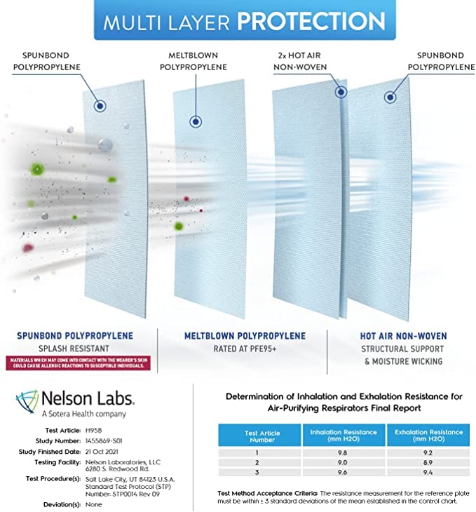 Superior Protection & Breathability - BNX’s 5-layer filtration technology provides maximum protection, comfort and breathability. The active filter layer of these N95 masks is composed of ultra-high grade electrostatically charged meltblown polypropylene. Extremely breathable up to 50%+ more breathable than minimum requirement.