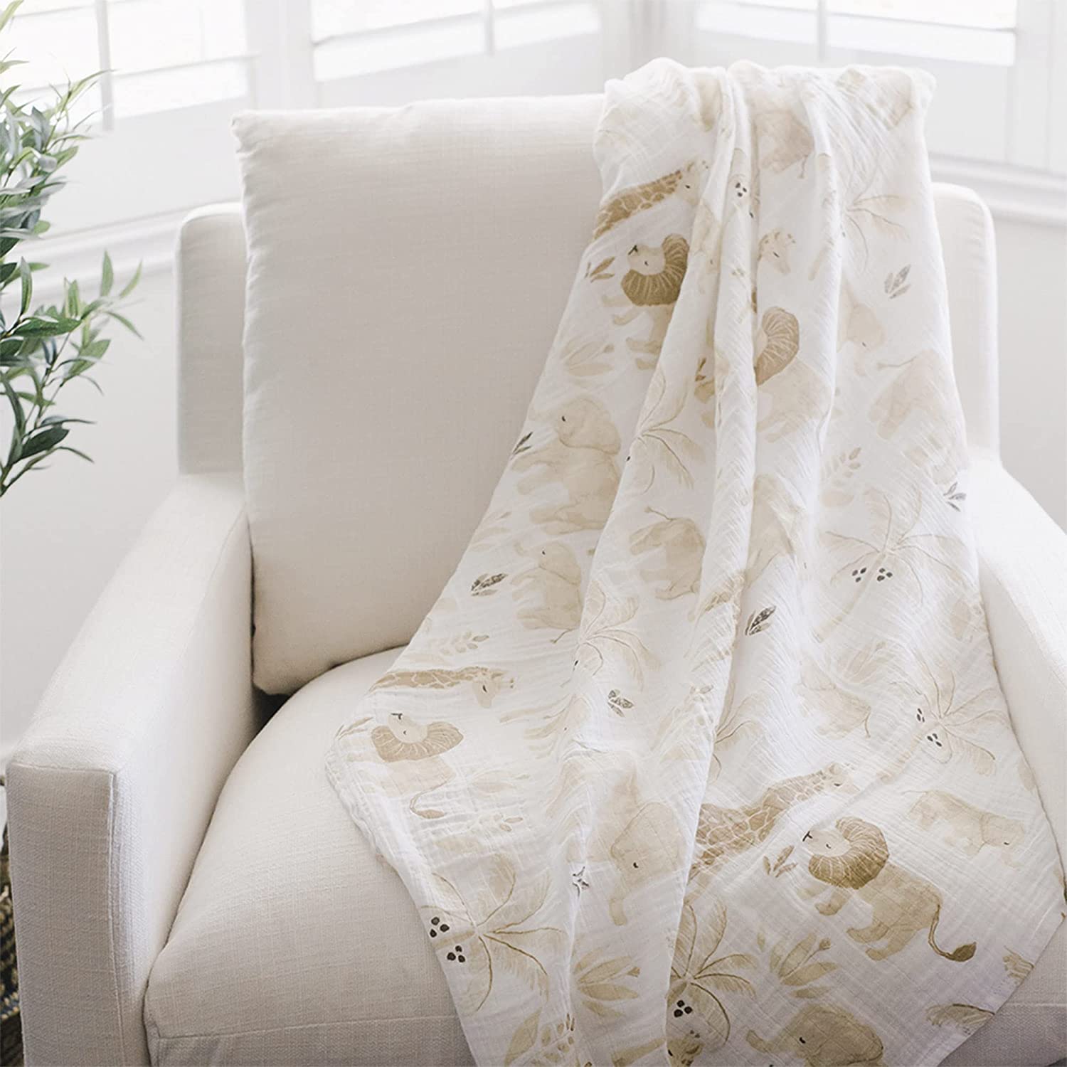 SIZE: One 47" x 47" pre-washed cotton muslin swaddle blanket in safari animal print