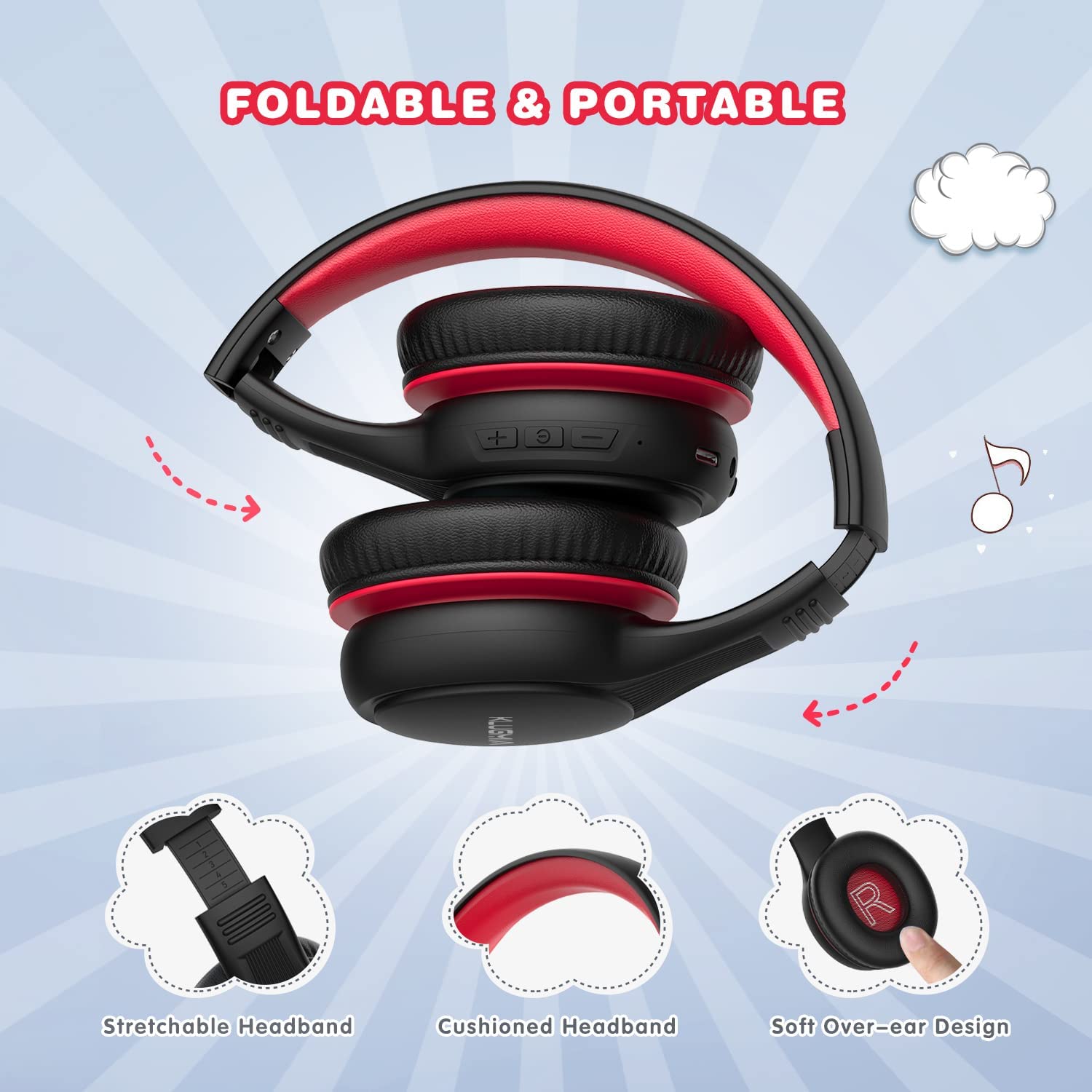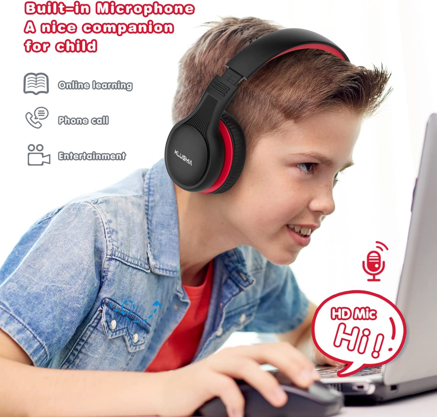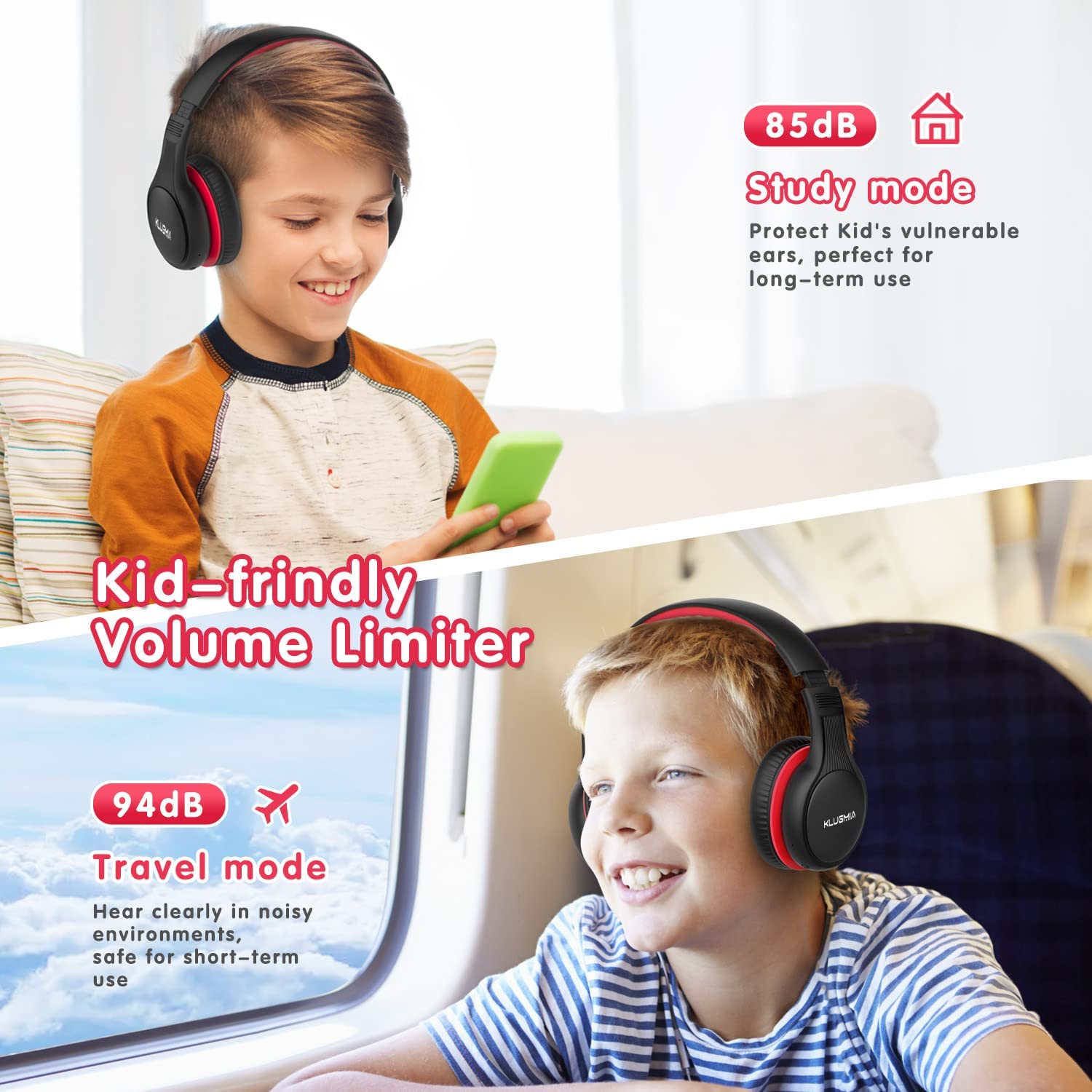 KLUGMIA Kids Bluetooth Headphones, 85/94dB Volume Limited Kids Headphones, Over Ear Toddler Headphones with Built-in Mic, Bluetooth 5.0, Foldable Wireless Headphones for Kids (Black red)