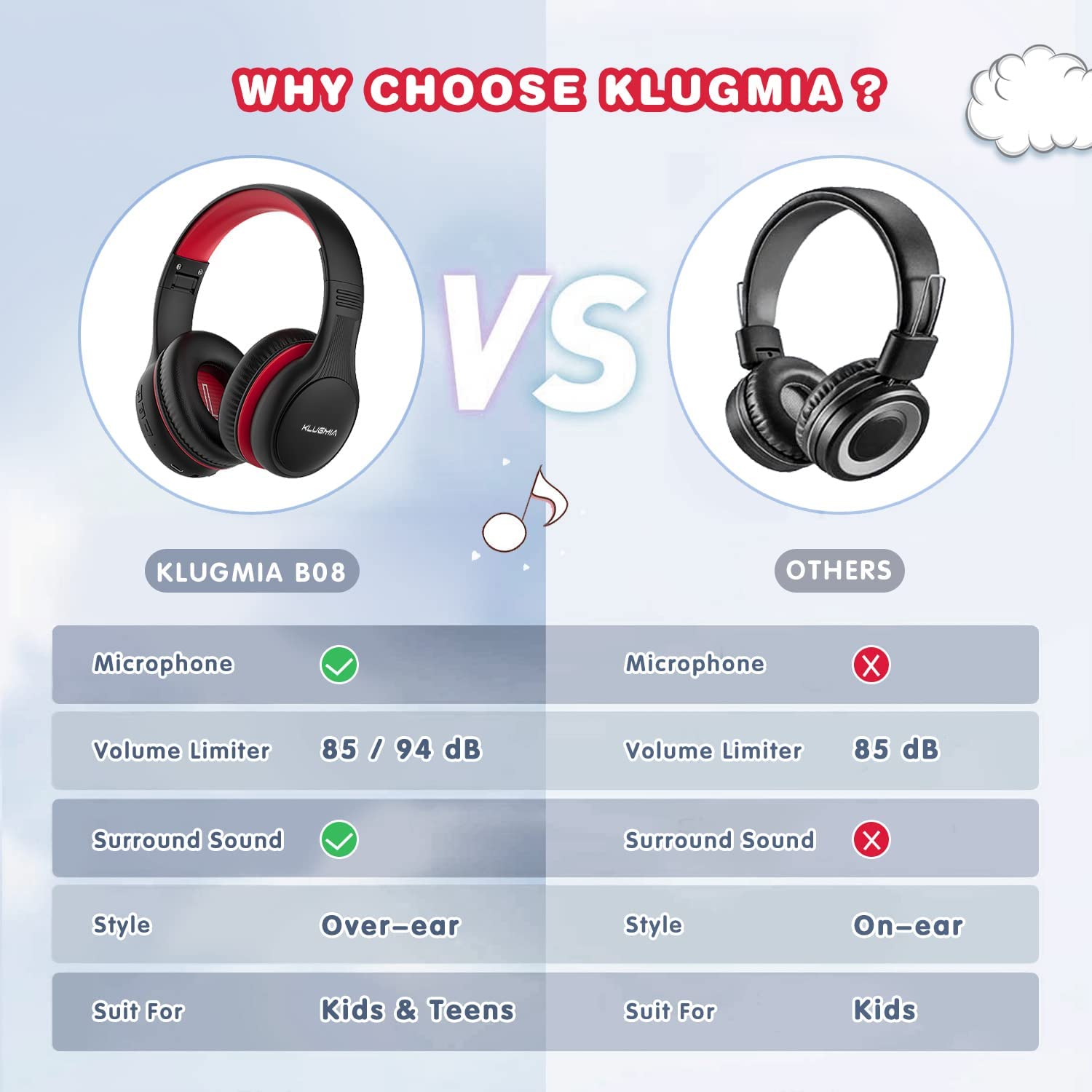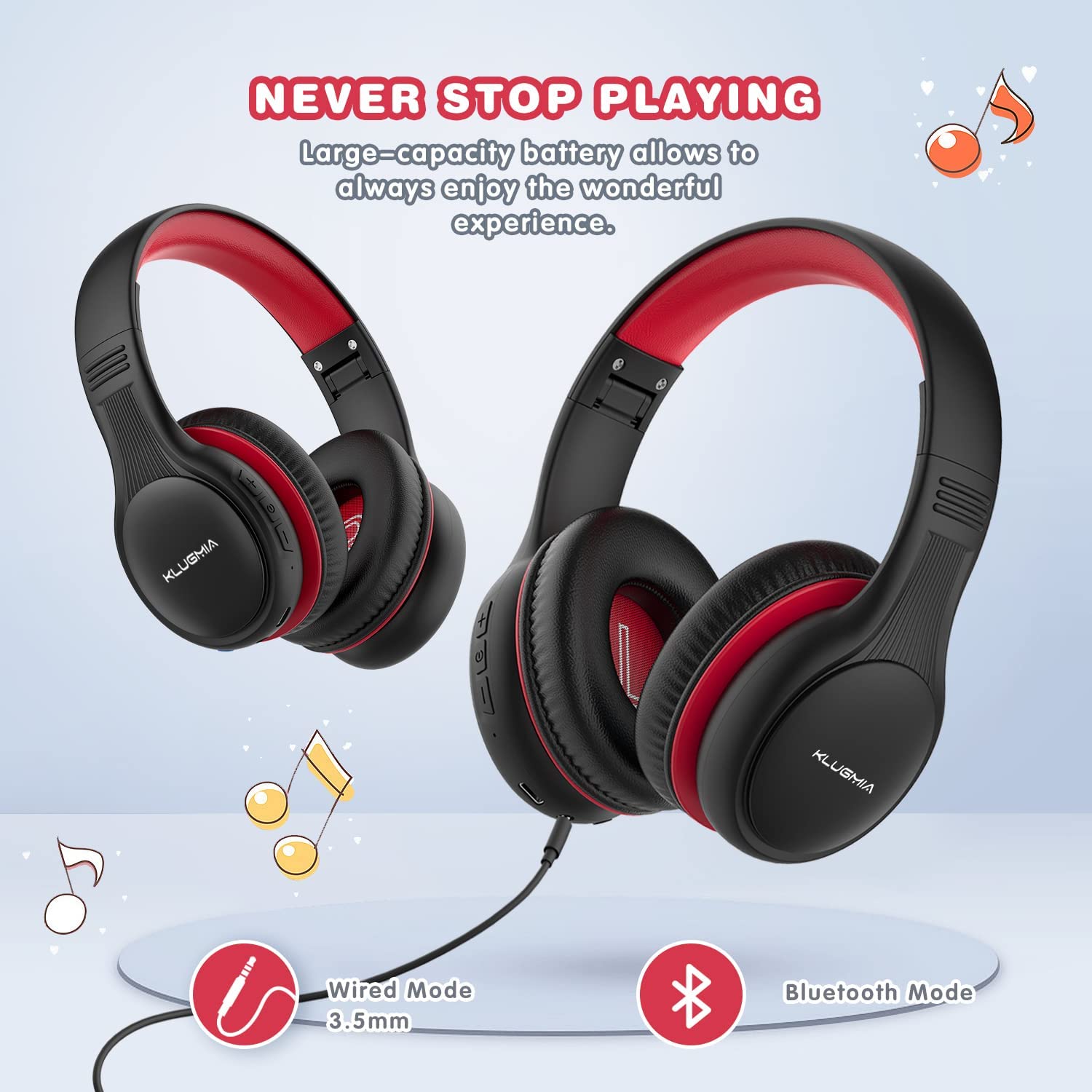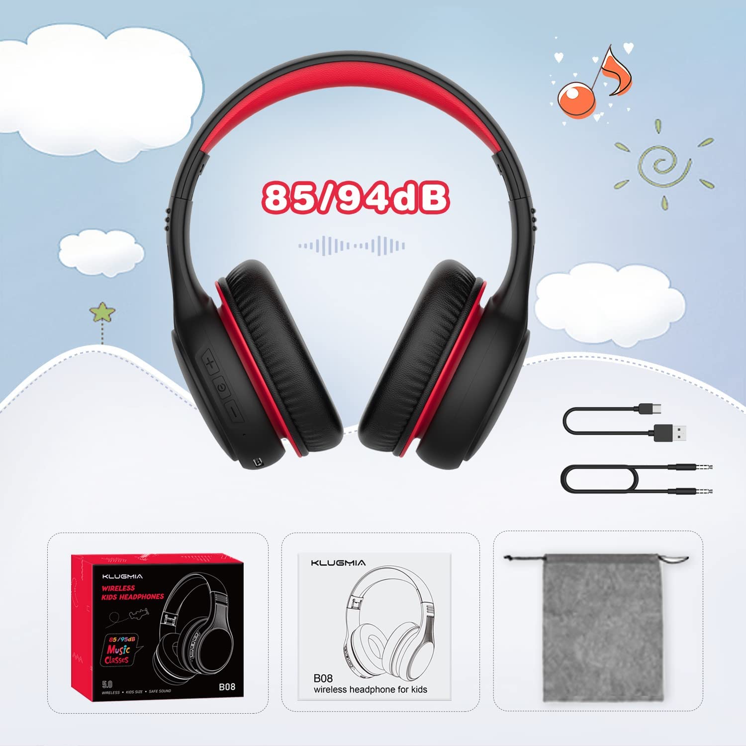 KLUGMIA Kids Bluetooth Headphones, 85/94dB Volume Limited Kids Headphones, Over Ear Toddler Headphones with Built-in Mic, Bluetooth 5.0, Foldable Wireless Headphones for Kids (Black red)