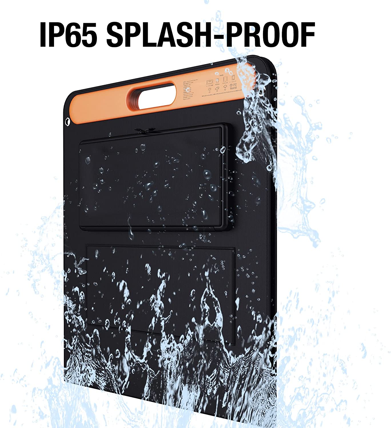 • Durable & Splash-proof: The ETFE-laminated case is durable enough to extend the lifespan of the solar panel. The IP65 water-resistant rating protects it from water splashing (Do not place it under the rain, or to soak in water). The zippers on the pocket can hold the power cords, and cover the power port.