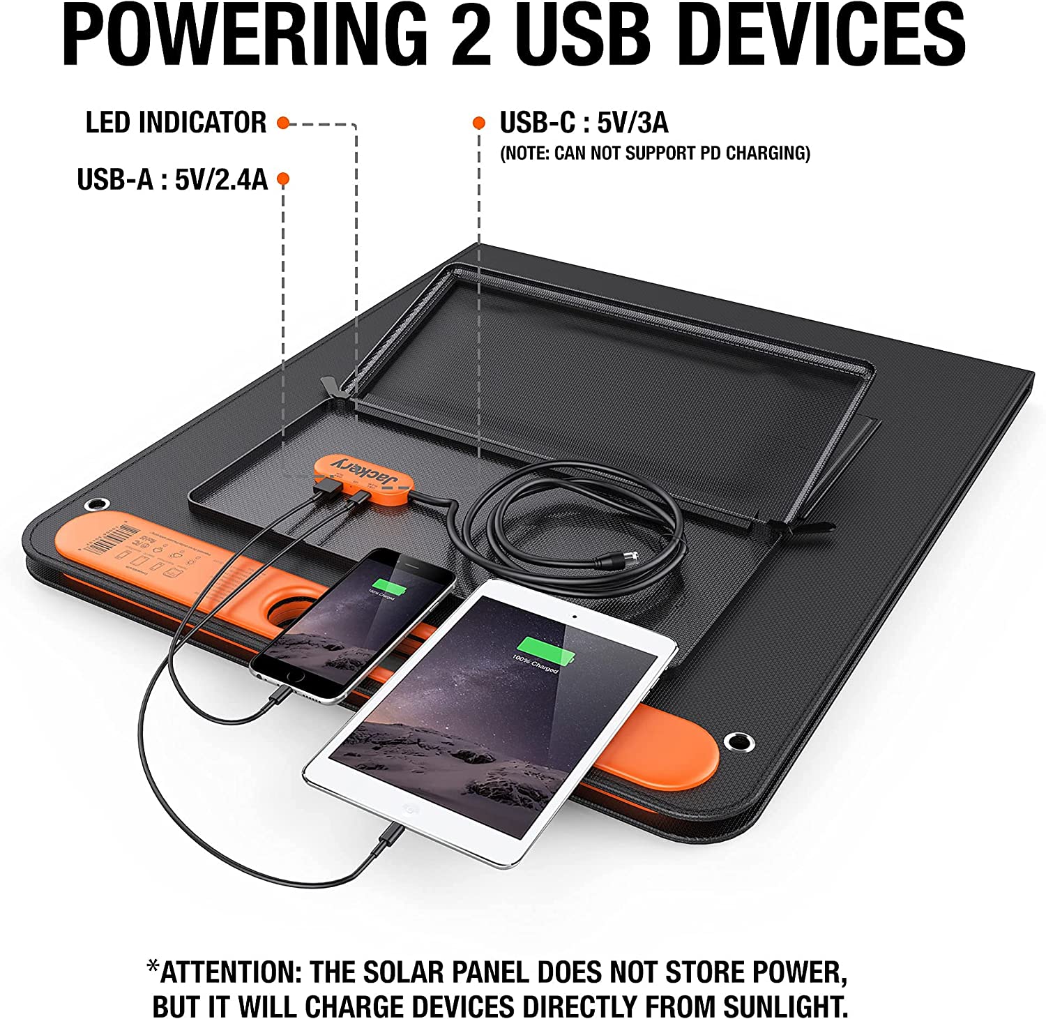 • Compatible & Versatile: Jackery solar panel is compatible with Jackery 240/300/500/1000/1500 power station (sold separately), ideal for road trip, camping trip, RV, and over-landing. The lightweight solar panel features 1* USB-C(5V,3A) output port and 1* USB-A(5V, 2.4A) output port to charge 2 small devices directly.
