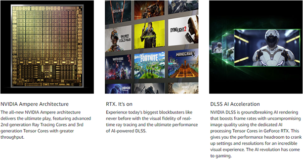 • 3rd Generation Tensor Cores: Get up to 2X the throughput with structural sparsity and advanced AI algorithms such as DLSS. Now with support for up to 8K resolution, these cores deliver a massive boost in game performance and all-new AI capabilitiesAvoid using unofficial software