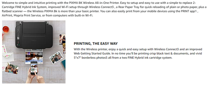 - PRINTING MADE EASY - With the PIXMA Printer, enjoy a quick and easy setup with Wireless Connect and an improved Web Getting Started Guide. In no time you’ll be printing crisp black text & documents, and vivid 5"x7" borderless photos5 all from a two FINE Hybrid ink cartridge system.