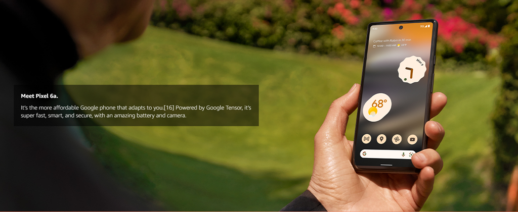 Meet Pixel 6a, the more affordable Google phone that adapts to you.[8] Powered by Google Tensor, it’s super fast and secure, with an amazing battery and camera. And it’s an unlocked Android smartphone, so you can choose the data plan and carrier that work for you.[1] LEGAL [1]Works with all major carriers. 5G service is carrier dependent. Requires a 5G data plan (sold separately). 5G service not available on all carrier networks or in all areas. Contact carrier for details. 5G service, speed and performance depend on many factors, including carrier network capabilities and signal strength. Actual results may vary. Some features not available in all areas. Data rates may apply. See g.co/pixel/networkinfo for info. [2]Estimated battery life based on testing using a median Pixel user battery usage profile across a mix of talk, data, standby, and use of other features. Average battery life during testing was approximately 29 hours. Battery life depends upon many factors and usage of certain features will decrease battery life. Battery testing conducted in California in early 2022 on pre-production hardware and software, using default settings. Battery testing conducted using Sub-6 GHz non-standalone 5G (ENDC) connectivity. Actual battery life may be lower. [3]Requires Google Photos app. Magic Eraser may not work on all image elements. [4]Wired charging rates up to 18W based on use of Google 30W USB-C® or Google 18W USB-C® Charger plugged into a wall outlet. Actual results may be slower. Adapters sold separately. Compatible with USB PD 3.0 PPS adapters. [5]Not available in all languages or countries. Not available on all media or apps. See g.co/pixel/livetranslate for more information. Translation may not be instantaneous. 3Your Pixel will receive feature drops during the applicable Android update and support periods for the phone. See g.co/pixel/updates for details. [6]Internet connection required during setup only. [7]Designed to comply with dust and water protection rating IP67 under IEC standard 60529 when each device leaves the factory but the device is not water or dust proof. The accessories are not water or dust resistant. Water resistance and dust resistance are not permanent conditions and will diminish or be lost over time due to normal wear and tear, device repair, disassembly or damage. Dropping your device may result in loss of water/dust resistance. Liquid damage voids the warranty. See g.co/pixel/water for details. [8]Compared to Pixel 5a. [9]Deblurring may not work on all photos or videos with faces. [10]Some third party apps and data may not be transferred automatically. Visit g.co/pixel/copydatahelp for information. [11]Measured diagonally; dimension may vary by configuration and manufacturing process. Smooth Display is not available for all apps or content. Smooth Display automatically adjusts to optimize for best viewing and battery performance. [12]Measured diagonally; dimension may vary by configuration and manufacturing process. [13]Maximum resolution and field of view with RAW image files setting turned on. Setting is turned off by default. See g.co/pixel/photoediting for more information. [14]Storage specifications refer to capacity before formatting. Actual formatted capacity will be less. [15]Your Pixel will receive feature drops during the applicable Android update and support periods for the phone. See g.co/pixel/updates for details. [16]Compared to MSRP of Pixel 6. [17]See g.co/pixel/astrophotography for details.