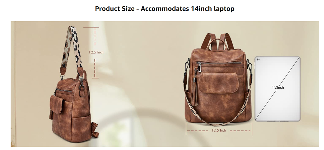 【DIMENSION】 Backpack: (L) 12.50 x (W) 6 x (H) 13 inches. Wristlet: (L) 8.75 x (H) 6 inches. Adjustable back straps: 35.55"(longest size). Detachable shoulder strap: 12.50". You can easily fit a 14-inch laptop, office papers, cell phones, water bottles, clothes and your daily items into this women's backpack purse.