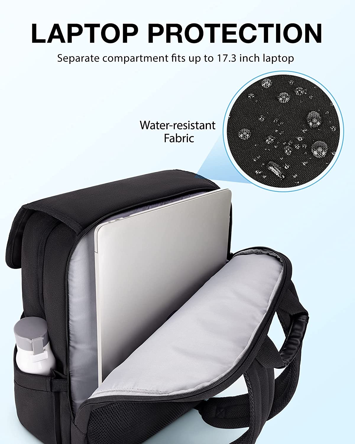 Large Capacity - The laptop backpack, 12.2"L x 7.9"W x 17.7"H, 1.76lbs, provides roomy capacity to store your clothing, A4 folders, books, 17.3'' laptop, tablet, chargers, mouse, textbooks, water bottle, umbrella, and other daily accessories. The width of the main compartment can accommodate up to a 2-inch plus a 3-inch binder. The airline-approved carry-on can be fitted overhead and under-seat, it's ideal for a weekend trip, business trip, or travel