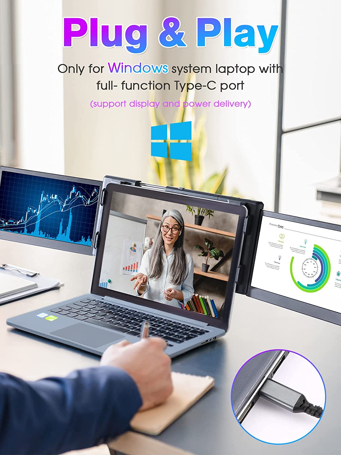 【Only One Cable Needed】Suitable for 13.3"-16.5" Laptops, Compatible with Windows system laptop by only one type-C cable if the type-C port of your laptop can supply over 5V2A power, and no need driver installation,then you can light up the whole two screens of the laptop 3 screen extender.(Note:Pls make sure that your laptop has full function type C port which support power,data transmission and display,such as thunderbolt3 and thunderbolt4)