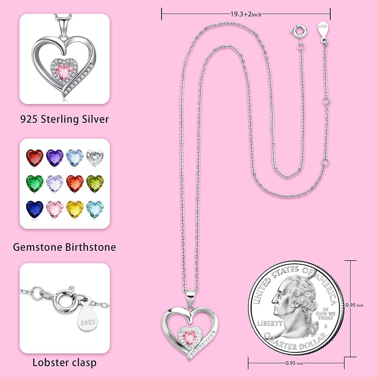 GLIVEOR Heart Birthstone Necklace for Women, S925 Sterling Silver Necklace Birthstone Necklace Heart Necklace for Women Teen Girls Birthday Jewelry Gifts for Women Teen Girls