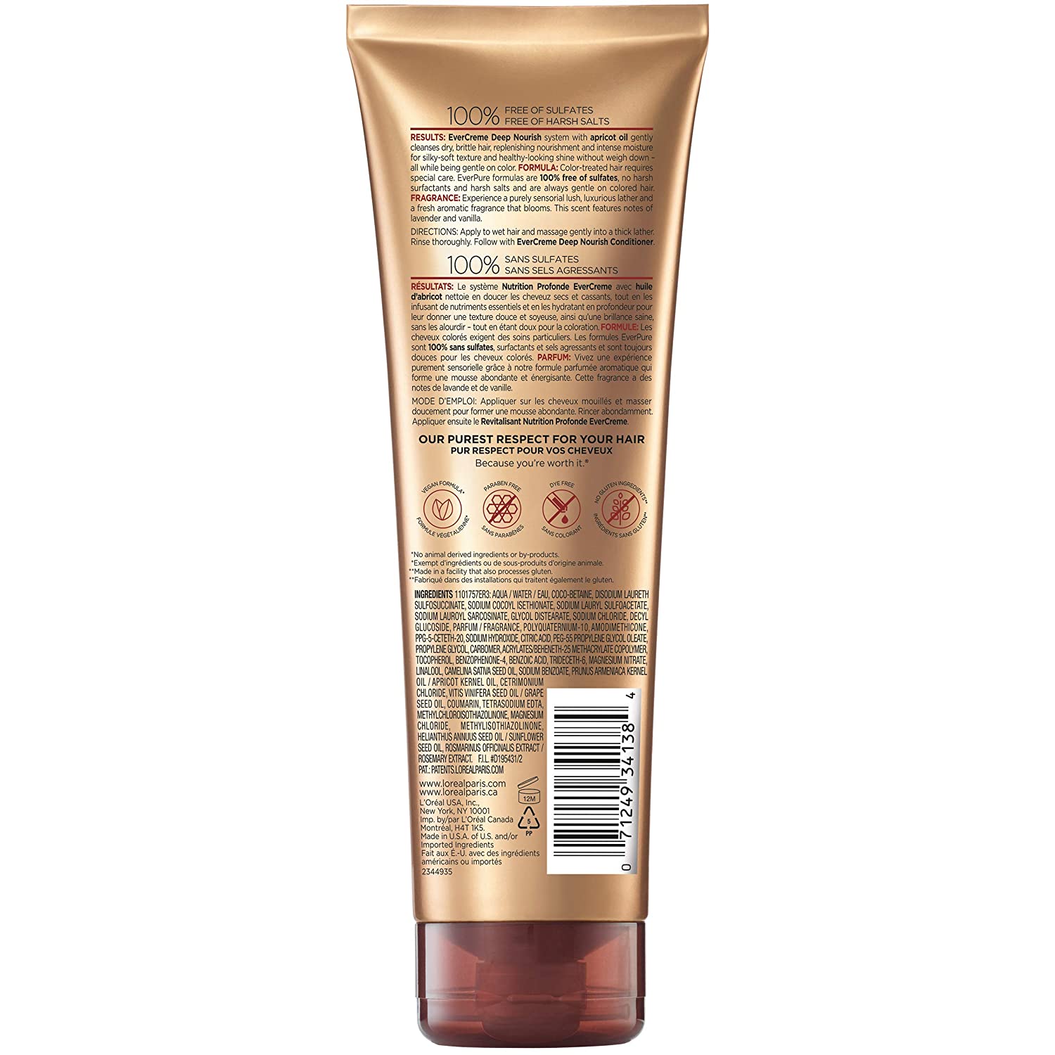 L’Oral Paris EverCreme Deep Nourish Shampoo is a lightweight sulfate free shampoo that moisturizes and nourishes dry hair for silky-soft texture and healthy shine without weigh down. Our shampoo for dry hair is especially gentle on color treated hair. Hydrating Apricot oil deeply conditions and smooths, leaving hair looking healthier after the 1st use. Our formulas are especially gentle on color treated hair.There are no harsh sulfates, salts or surfactants that can strip, dull and damage hair. Experience a purely sensorial lush, luxurious lather and a fresh aromatic fragrance that blooms. • Infuses Essential Nourishment to Revive Hair • Sulfate Free • No Heavy Waxes • No Weigh Down Apply to wet hair and massage gently into a thick lather. Rinse thoroughly. Follow with EverCreme Deep Nourish conditioner. Use with EverStrong Break Proof Lotion.