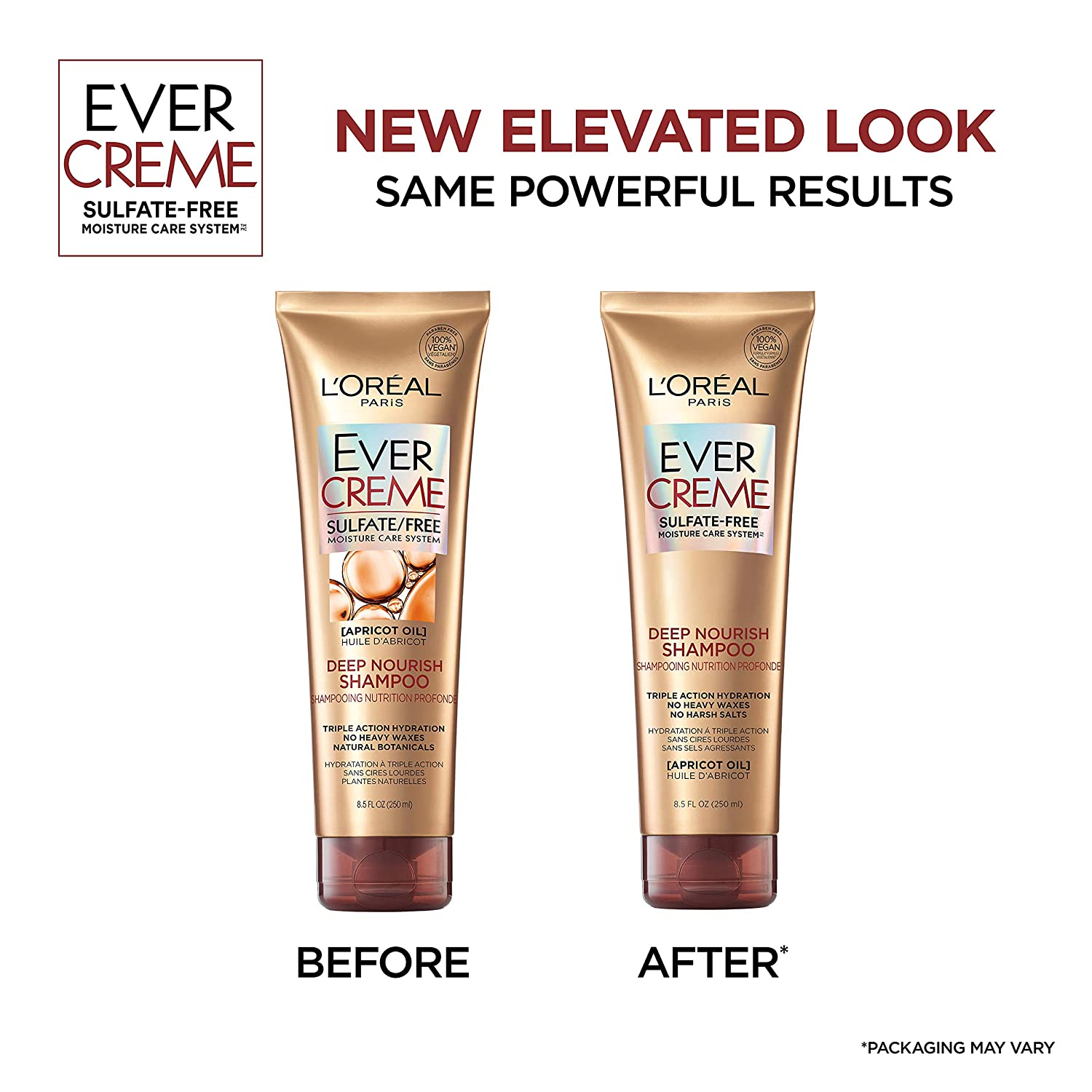L'Oreal Paris EverCreme Sulfate Free Shampoo for Dry Hair, Triple Action Hydration for Dry, Brittle or Color Treated Hair, with Apricot Oil, 8.5 Fl; Oz (Pack of 1) (Packaging May Vary)