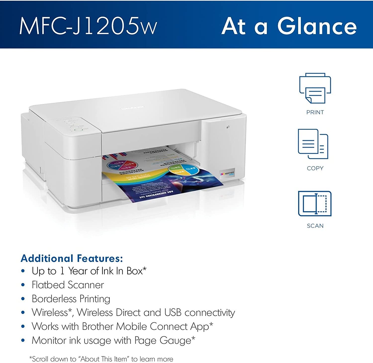 Get ready for a productive day with help from this Brother printer. The wireless printer offers easy mobile printing options, a Hi-Speed USB 2.0 interface and web-based printing for versatility. The color printer features a 150-sheet input tray to help your team print big jobs without having to constantly refill it. NO INK REPLACEMENT FOR UP TO 1-YEAR(1): Experience truly uninterrupted printing, exceptional savings and super convenience with up to 1-year of ink using only the four cartridges provided in-box.(1) PUT THE POWER OF PRINTING AT YOUR FINGERTIPS: The simple to use Brother Mobile Connect(2) App delivers easy onscreen menu navigation for printing, copying, scanning and printer management from your mobile device. BROTHER REVOLUTIONARY INKVESTMENT TANK SYSTEM: Brother INKvestment Tank printers feature reengineered ink cartridges that hold more ink than traditional cartridges and deliver a continuous ink supply for truly convenient, uninterrupted printing. ELIMINATE INK REPLACEMENT GUESSWORK: Print with confidence using the Brother Page Gauge,(3) a visual, numerical way to know the amount of ink used and the amount of ink remaining to help take the guesswork out of when to replace ink. USE BROTHER GENUINE INK: Engineered to work with INKvestment Tank inkjet printers, a full range of INKvestment Tank cartridges is available that deliver high quality prints and reliable page yields: LC404BK, LC404C, LC404M, LC404Y and LC404 3PK. BROTHER AT YOUR SIDE. Brother offers a 2-Year Limited Warranty and At Your Side support for the life of your printer. REFRESH: Buy Genuine Brother Ink Cartridges. When you do need to replace your ink supply, choose Brother Genuine LC404 inks. To avoid worrying about running out of ink again, get started with Refresh EZ Print Subscription service and save up to 50% on ink(5). DISCLAIMERS: (1)Based on average monthly print volumes of approx. 100 pages at 60% black/40% color pages in accordance with ISO/IEC 24711 using 4 cartridges