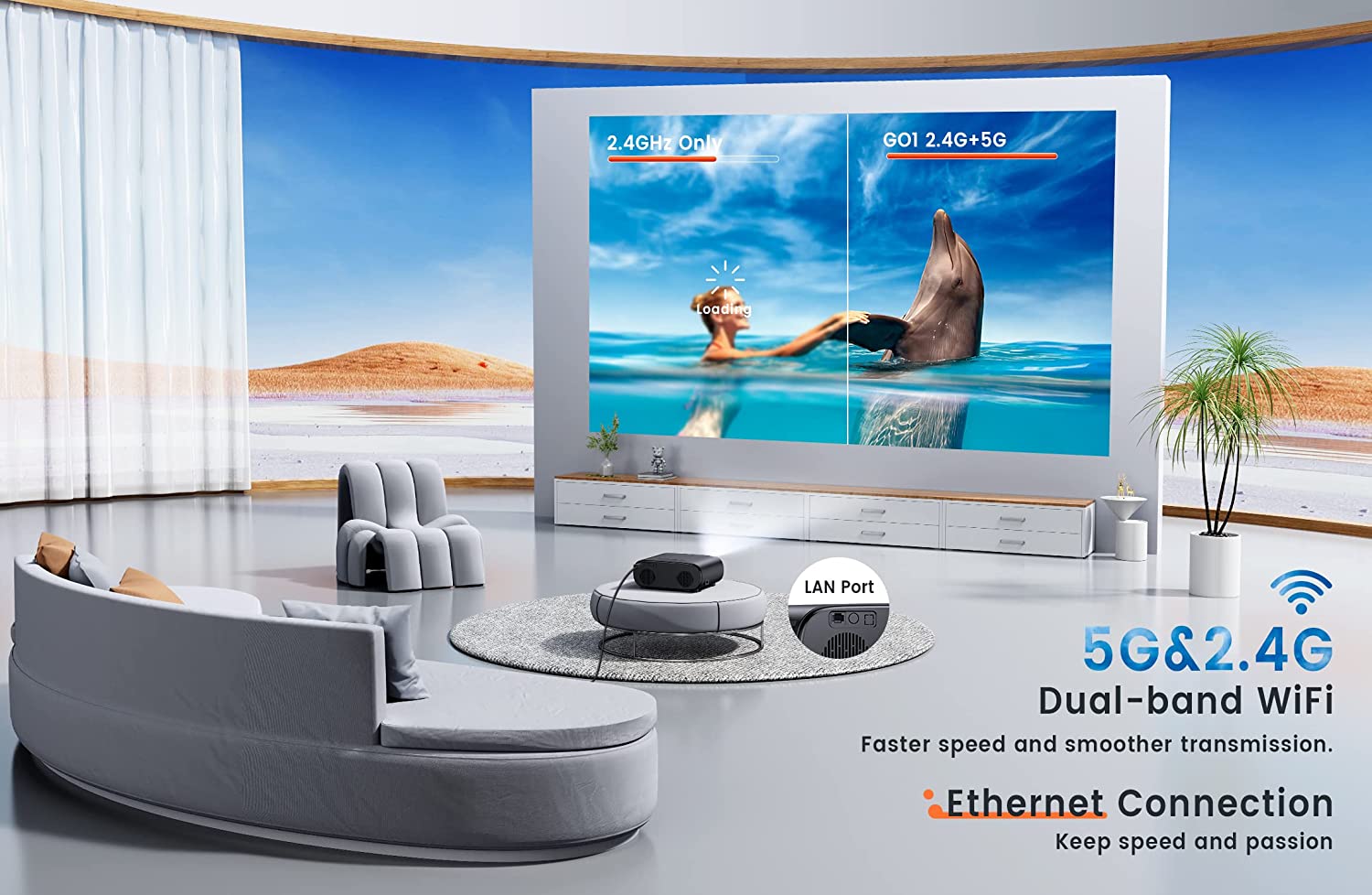 ♥【5G+2.4G WiFi Projector & LAN Cable Connection】GO1 video projector equipped with 2.4G & 5G dual-band WiFi ensures both stability and speed. As the first projector on the market with Ethernet cable connectivity, it produces a more stable transmission. The network latency is reduced by 60% compared to other WiFi projectors, bringing a smoother watching experience like in the cinema. No lag playing the game and the passion stay! Entertainment gets easier and more varied with this home projector.