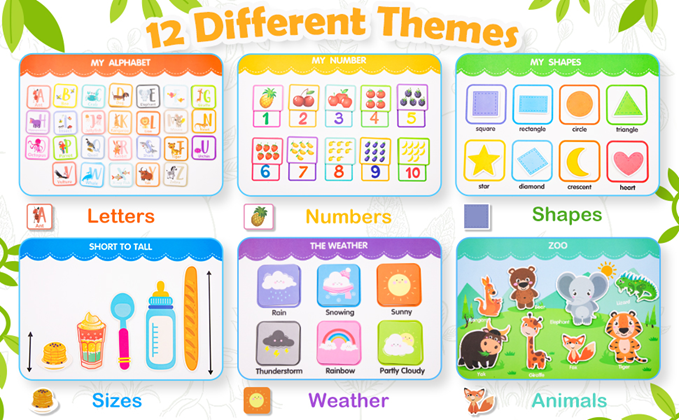 - 【Toddler Activity Book with 12 Themes】This preschool learning book is designed with 12 themes for children to learn. Toddler book includes letters, numbers, shapes, sizes, weather, animals, match patterns, feelings, count, seasons, facial recognition, and colors.