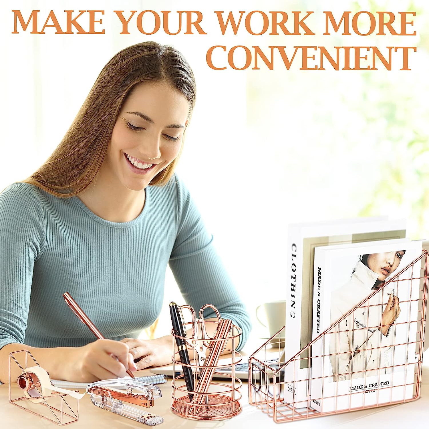 - Nice Combination: you will receive 1 piece of file holder, 1 piece of magazine file organizer, 1 piece of acrylic stapler, 1 piece of staple remover, 1000 pieces of staples, 1 piece of tape dispenser, 1 piece of pen holder, 2 pieces of pens, 1 pair of scissor, and 1 box of binder clips; The rose gold office supplies set can meet your daily and work needs, keeping your desk or desk drawer organized