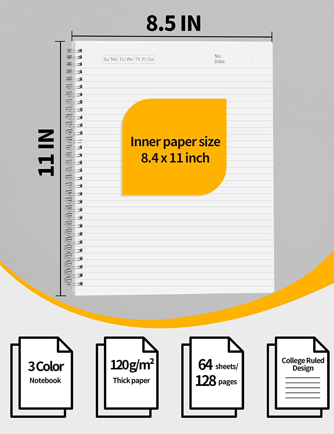 • 120 GSM THICK PAPER - Interior pages 80lb text 120gsm weight that resists ink bleed and ghost. Ruled notebook journal pages with smooth surface, which can bring you better writing and drawing experience. 3 pack includes blue, pink, and transparent. 64 sheets/ 128 pages per pack. Total 384 Pages! Each large college ruled notebook measures 8.5 x 11 inches, inner paper size is 8.4 x 11 inches. Good sized to throw into your backpack for on-the-go note-taking.
