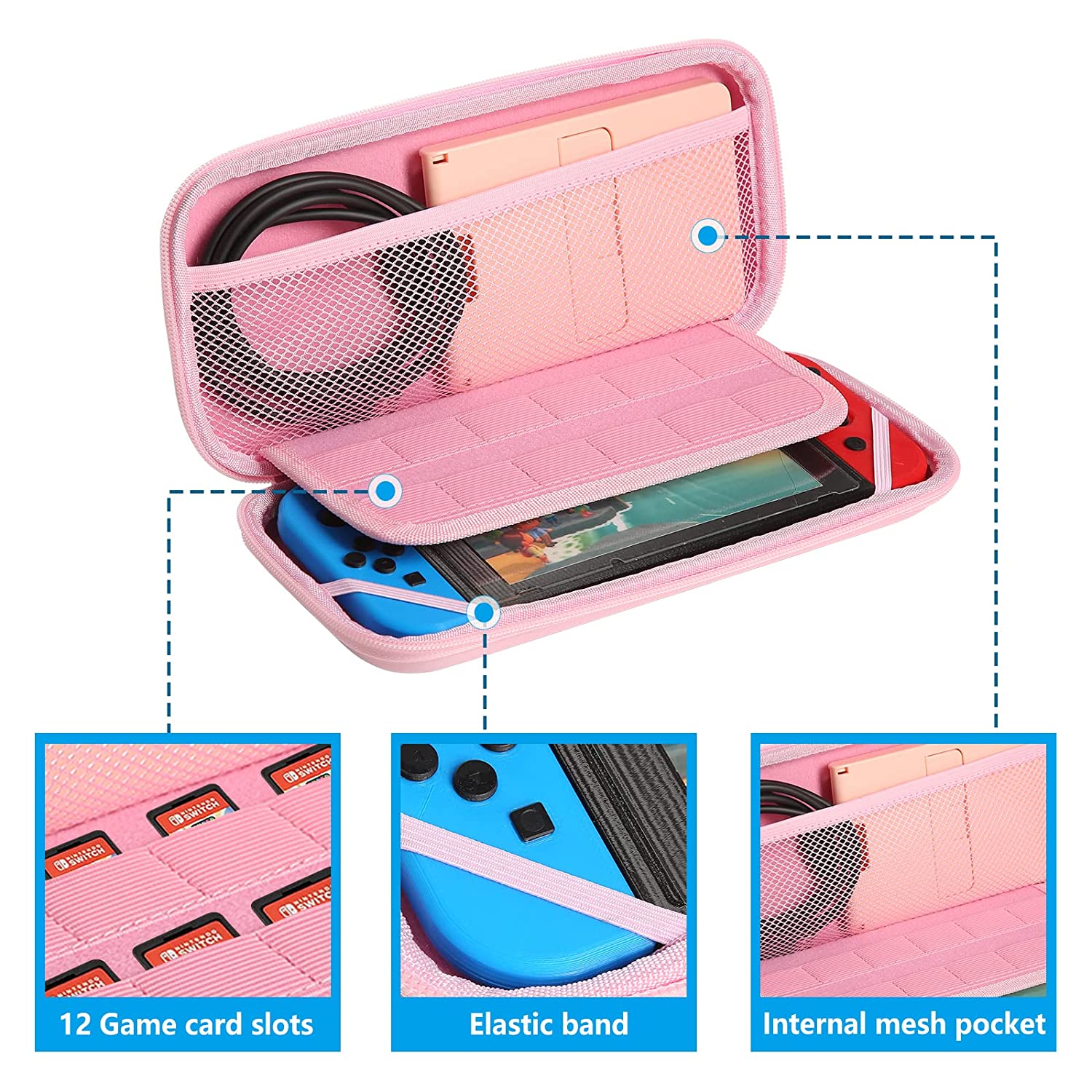 • ?【Large Protective Storage】The carry case with exact size but ensure enough space for all parts to keep switch and accessories organized. Portable Carrying Case for Switch/Switch OLED has a spacious mesh pocket for easy storage of some game accessories to avoid loss, such as USB cable, earplug and joy-con. 12 built-in game card holders inside the Switch/Switch OLED carry case, enough to put your favorite games cards like Mario Party, Zelda, etc.