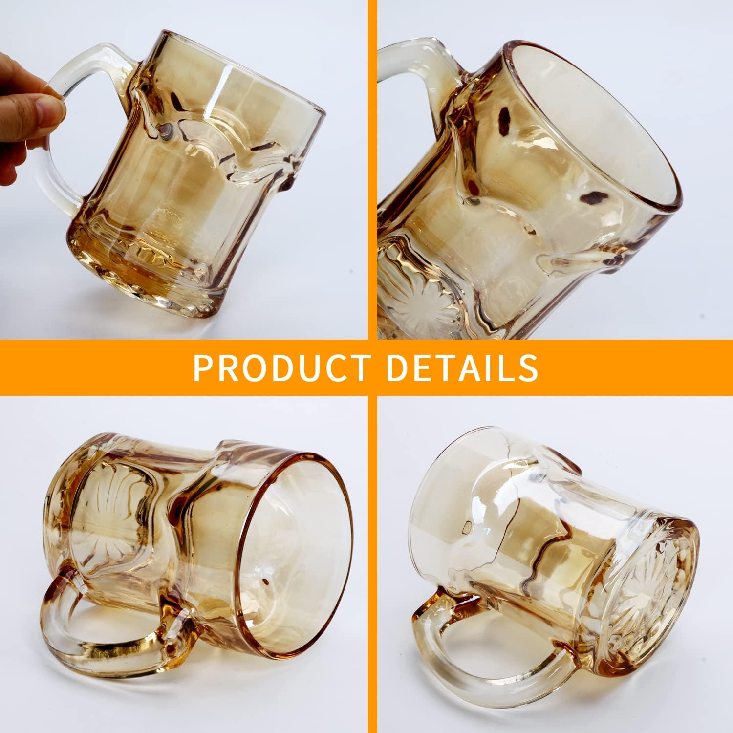 Ergonomically Handle-Feature with ergonomically handle which is easy to take up and down,perfect size to fit your hand properly,easy to grasp while allowing comfortable use for you to enjoy your favorite drinks in this elegant glass mugs.