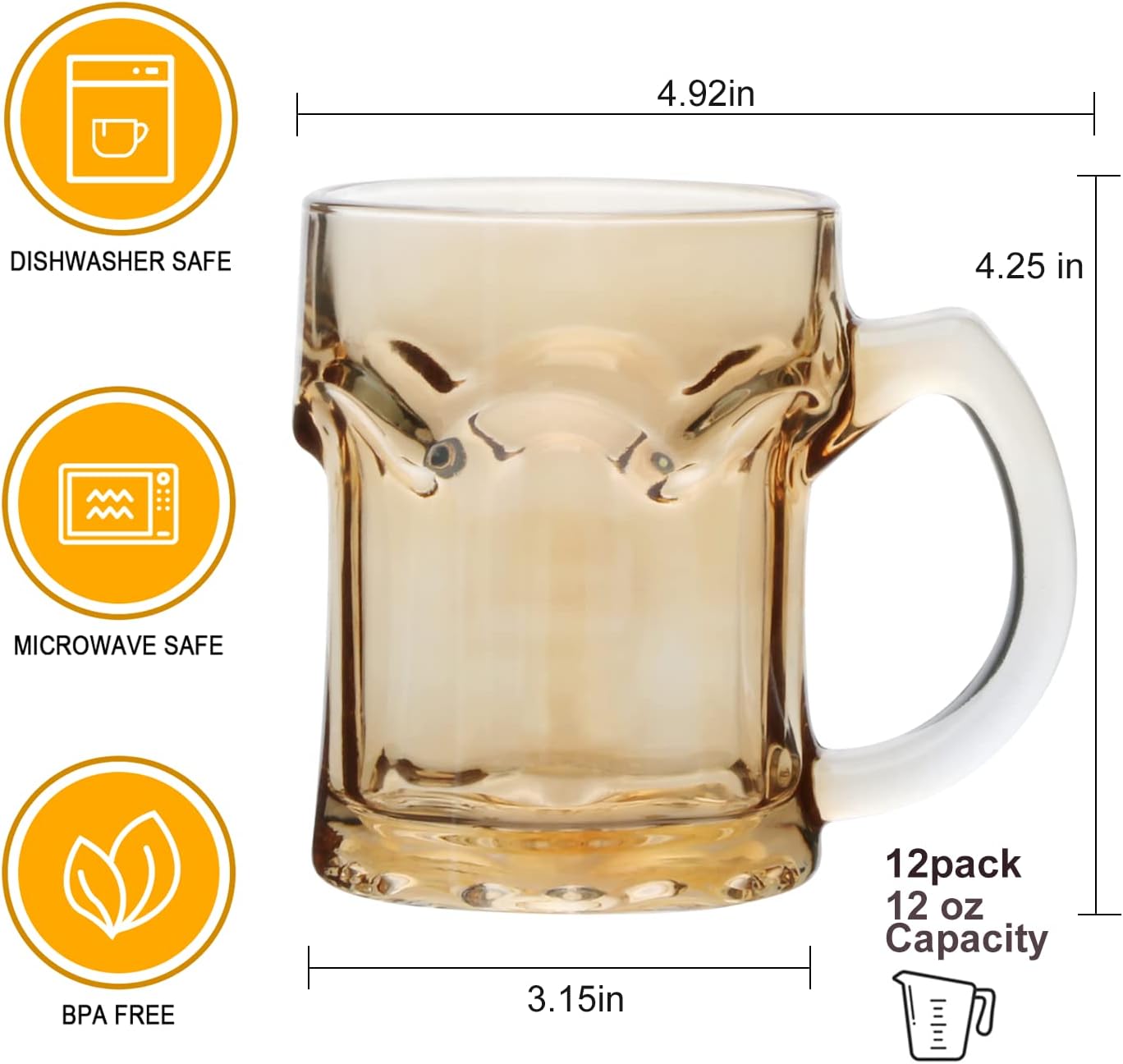 Value Set-Come in a set of 12 pack 350ml amber glass mugs in safety package,can hold 11 ounce liquid each,measuring 3.15 inches base width and 4.25 inches height.