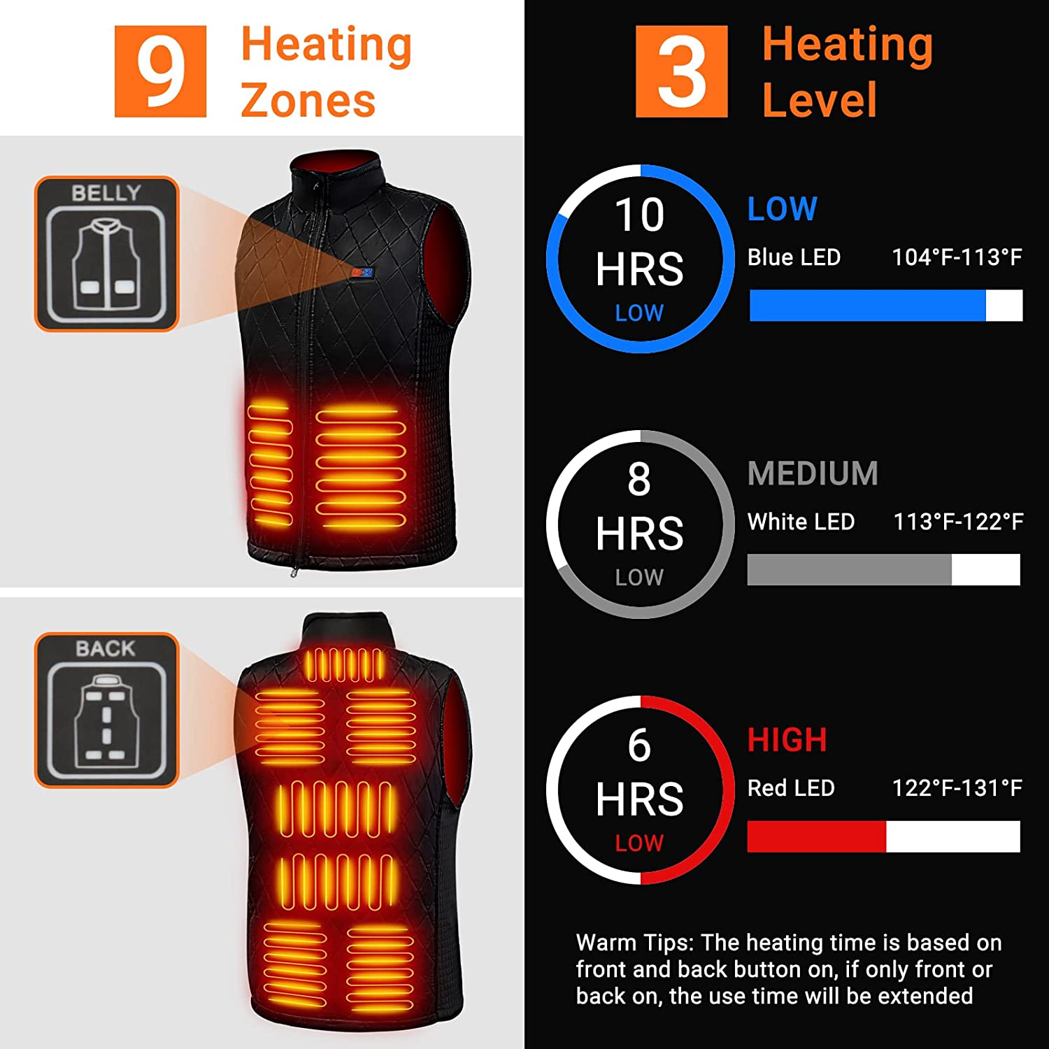 - 9 Heating Zones-The heated vests for men have 9 heating zones, which are Abdomen*2, Mid Back*2, Collar*1, Shoulder*2, Waist*2, the front and back heating zones are independently controlled by two switches. The heating zones are just right to warm up your core and hands in the pockets and the back zone is big enough to cover most of your back, enough warmer. The effective heat therapy to promote blood circulation, great for pain relief, relieve the discomfort of rheumatism & muscles.