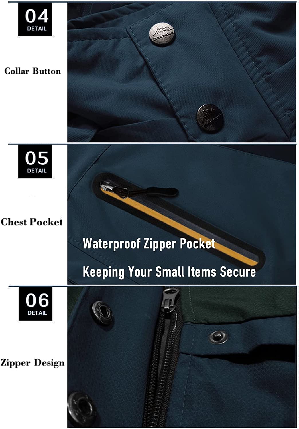 Multi Pockets: 2 Large Zipper Hand Pockets, 1 Waterproof Zipper Pocket on Left Chest, 2 Inner Pockets, Keeping Your Odds and Ends Secure.