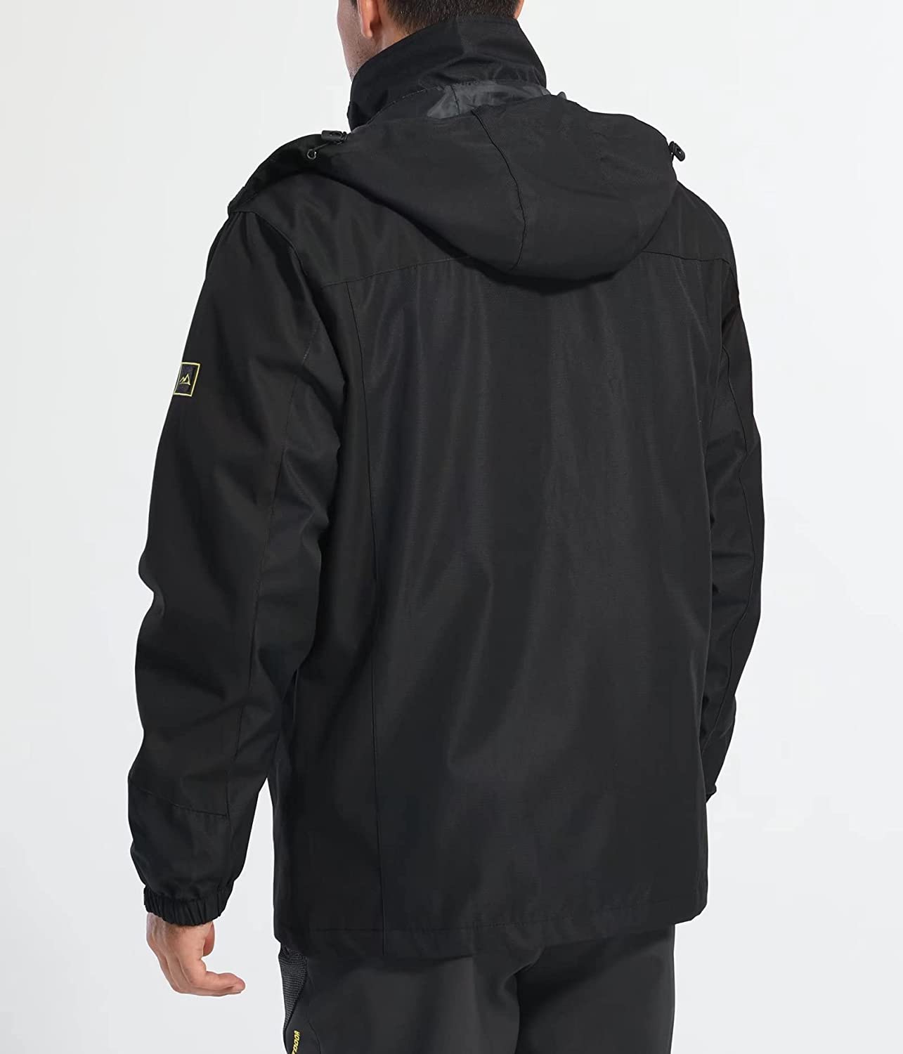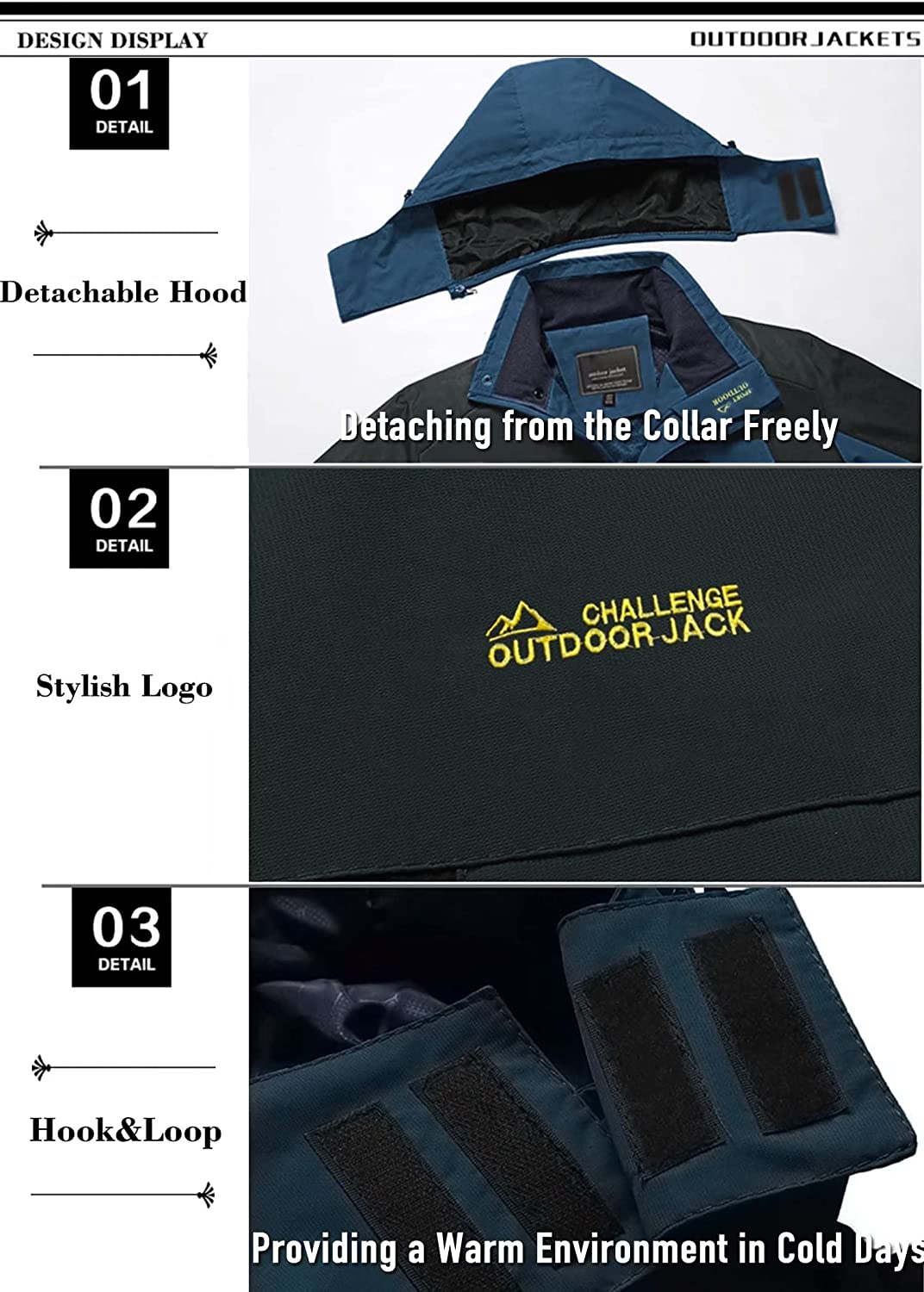 Outer: Windproof weather resistant soft shell Jacket,quick-dry material. Full-length zipper closure jacket with detachable & adjustable hood.