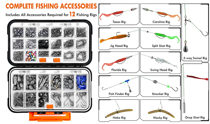Multiple fishing accessories can be combined into 12 fishing rigs for you to choose from, such as Texas Rig, Carolina Rig, Jig Head Rig, Split Shot Rig, Florida Rig, Swing Head Rig, Fish Finder Rig, Knocker Rig, Neko Rig, Wacky Rig, 3-way Swivel Rig, Drop Shot Rig, etc. Perfect for all water layers! Which can meet all you need for different fish you catch, such as Bass, Bluegill, Crappie, etc.