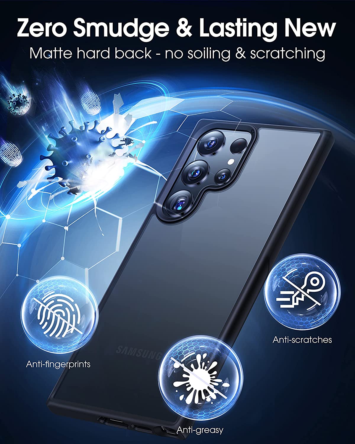 - 【Zero Smudge, Lasting New】Thanks to the zero-smudge matte hard backplane, it is sturdy, scratch-resistant and it stop 100% of fingerprints, oil & lint from sticking to your Samsung S23 Ultra case while providing a silky matte touch feeling.