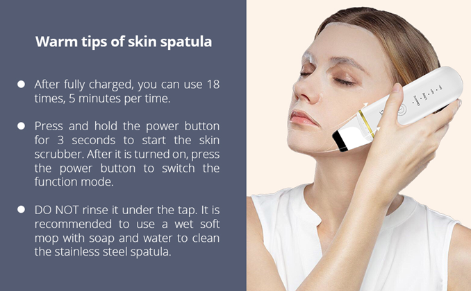 - Multifunctional Skincare Tool: 4 different modes make it a multifunctional skin scrubber face spatula. Experience a complete and well-designed skin care routine starting with a deep cleansing with this skin spatula. Dampened face and glide the skin spatula blackhead remover on the face. Mini spa day with every use!