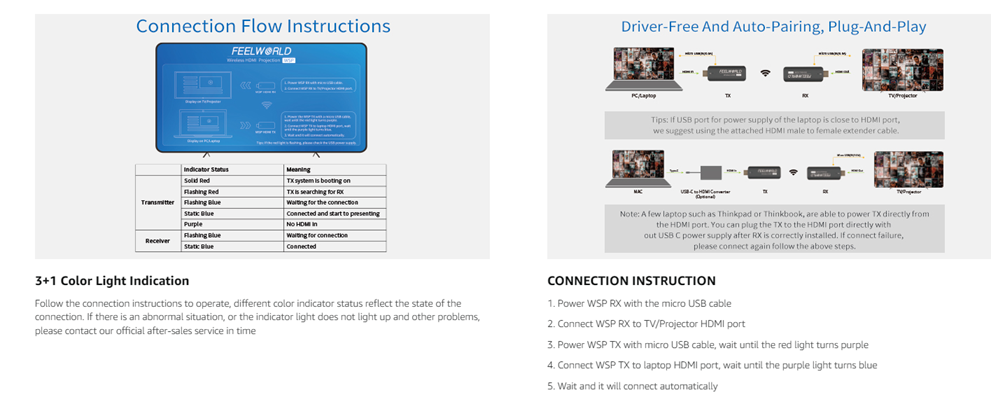 - 5GHz signal transmission:FEELWORLD HDMI Wireless device features 5 GHz wireless transmission technology, which makes video transmission more stable and faster.HDMI wireless transmission extenders are the perfect companion for conference rooms, digital home theaters, game centers, TV channels and more