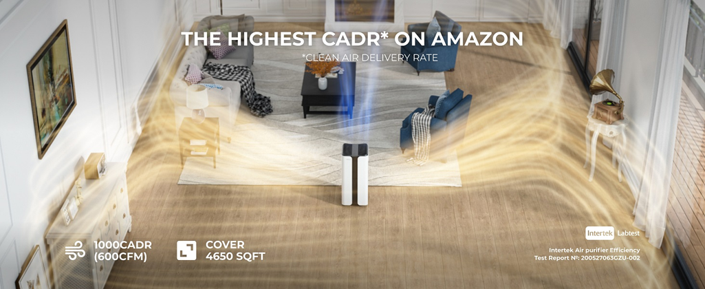- <b>SUPERIOR PURIFICATION CAPACITY: </b>Filters up to 4650 sqft in 1 hour/ 2325 sqft in 30 minutes with a 1000 CADR for Extra large room coverage. Dual air intake and twin-turbo fans offer up to 2X4 layers of filtration through two plastic pre-filters and two multi-Integrated Filter Sets - combining non-woven fabrics filter, H13 Medical Grade HEPA filter, and activated carbon filter in one set.